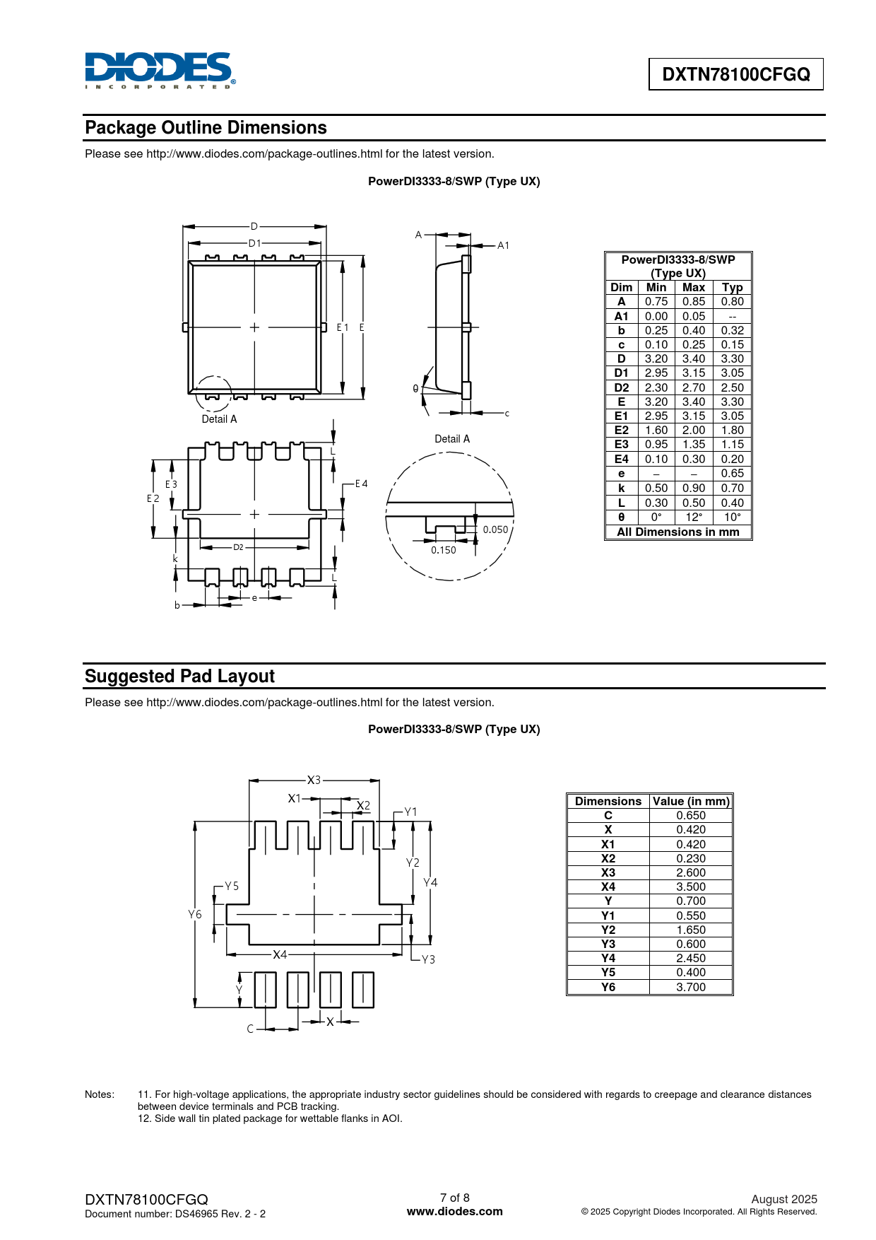 3.700 X C Notes: 11. For high-voltage applications, the appropriate industry sector guidelines should be considered with regards to creepage and clearance distances between device terminals and PCB tracking. 12. Side wall tin plated package for wettable flanks in AOI. DXTN78100CFGQ 7 of 8 August 2025 Document number: DS46965 Rev. 2 - 2