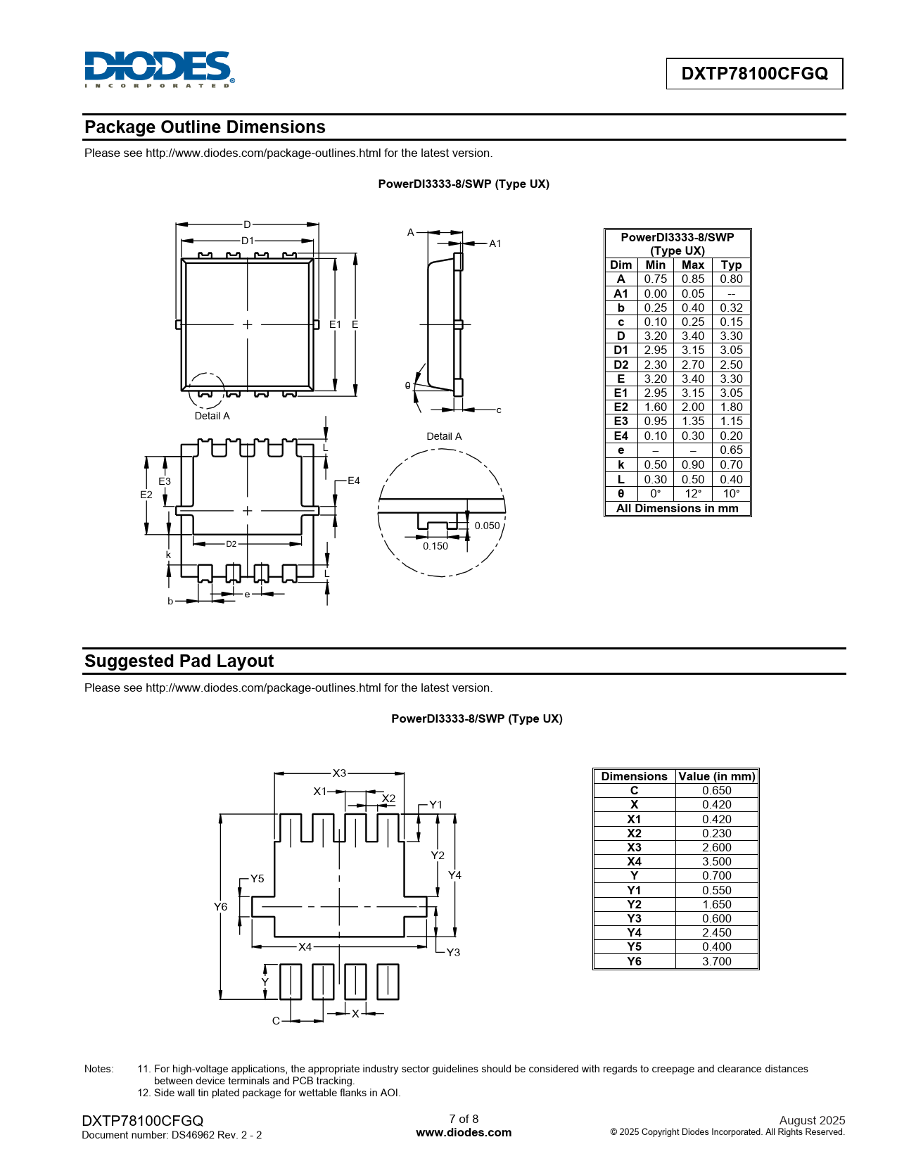 DXTP78100CFGQ. Package Outline Dimensions. PowerDI3333-8/SWP (Type UX). PowerDI3333-8/SWP. (Type UX). Dim Min Max Typ