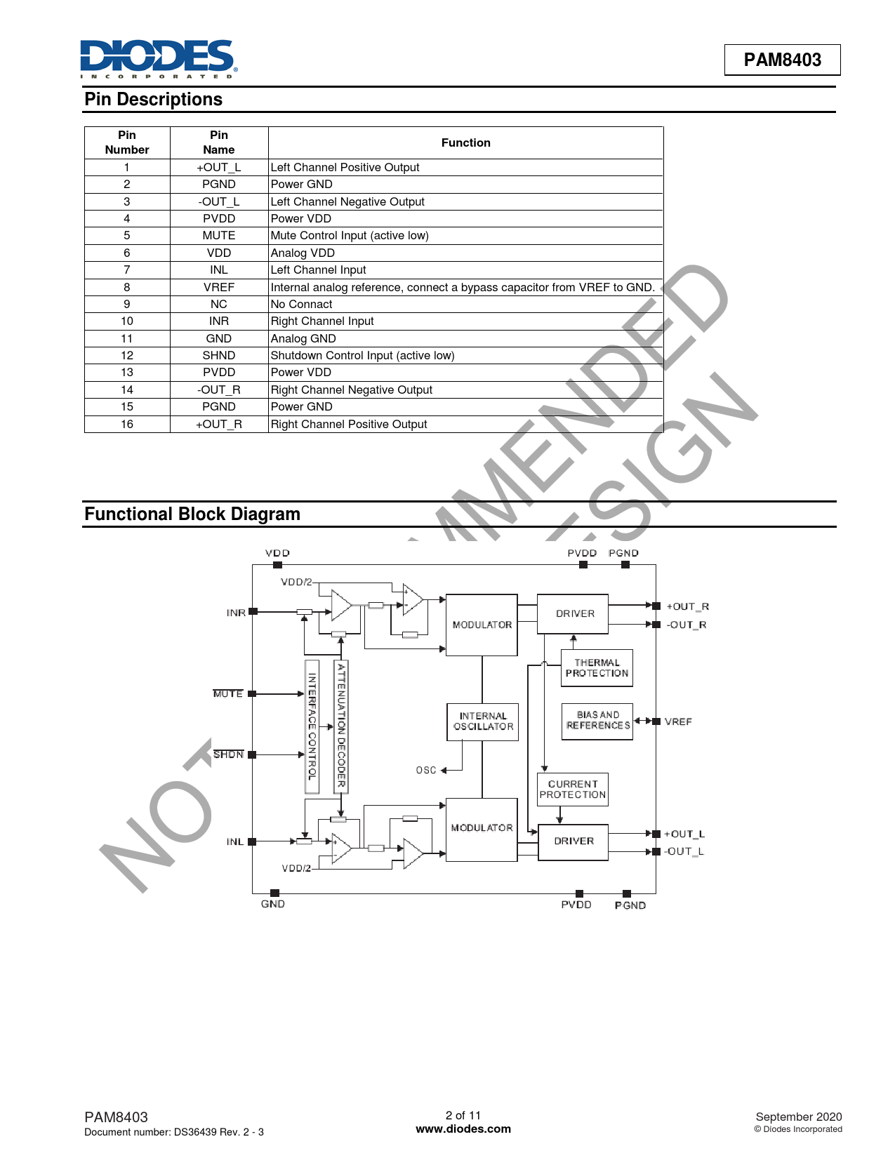 PAM8403. Pin Descriptions. Pin. Function. Number. Name. Functional Block Diagram. www.diodes.com