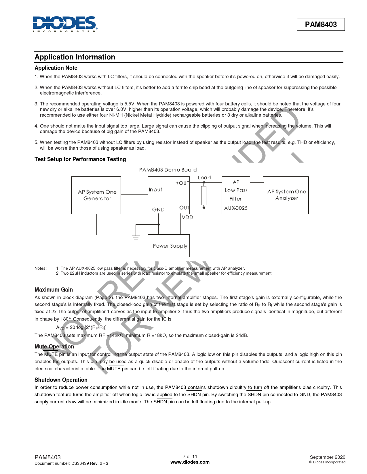 PAM8403. Application Information. Application Note. Test Setup for Performance Testing. Maximum Gain. Mute Operation