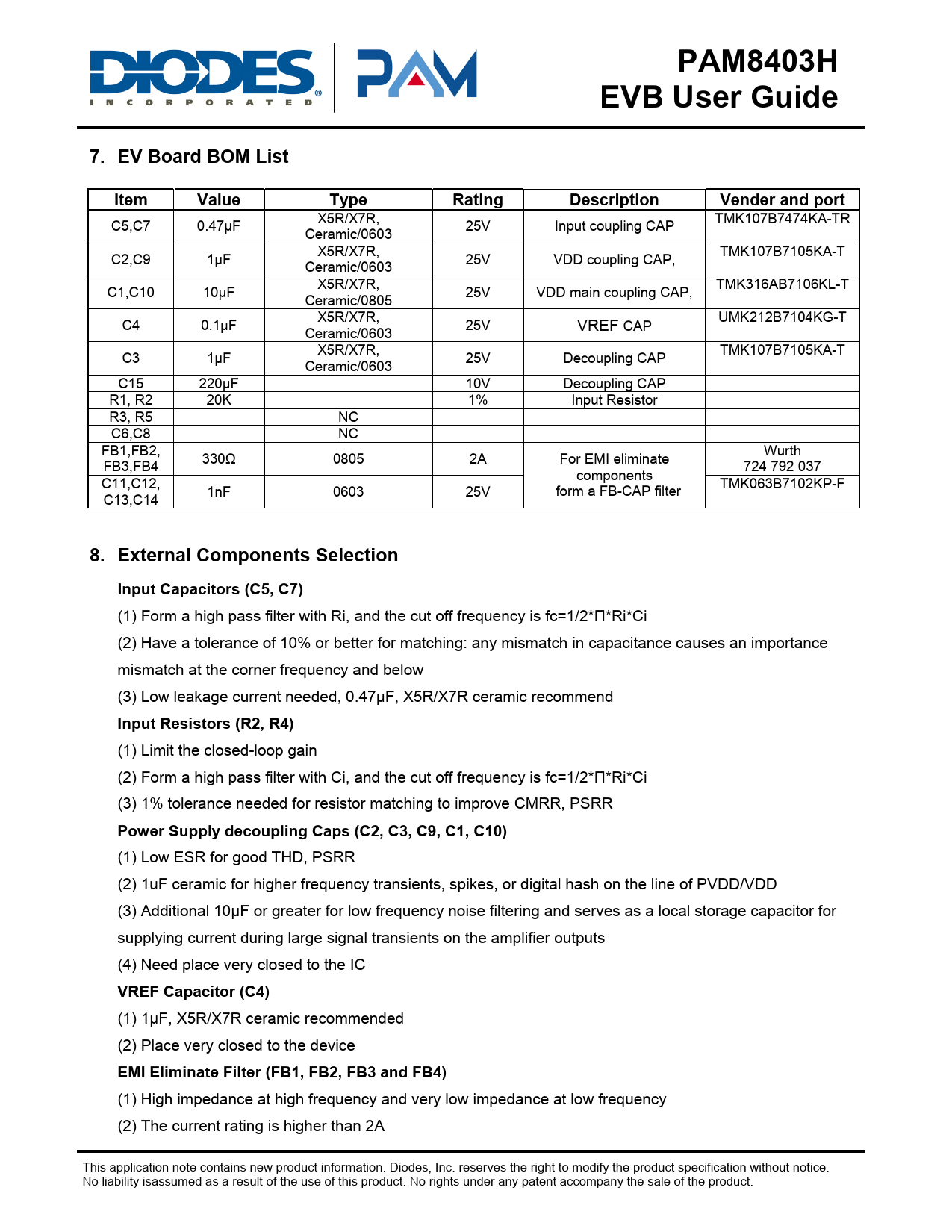 PAM8403HEVB User Guide7. EV Board BOM ListItemValueTypeRatingDescriptionVender and port X5R/X7R, TMK107B7474KA-TR C5,C7 0.47µF 25V Input coupling CAP Ceramic/0603 X5R/X7R, TMK107B7105KA-T C2,C9 1µF 25V VDD coupling CAP, Ceramic/0603 X5R/X7R, TMK316AB7106KL-T C1,C10 10µF 25V VDD main coupling CAP, Ceramic/0805 X5R/X7R, UMK212B7104KG-T C4 0.1µF 25V VREF Ceramic/0603 CAP X5R/X7R, C3 1µF 25V Decoupling CAP TMK107B7105KA-T Ceramic/0603 C15 220µF 10V Decoupling CAP R1, R2 20K 1% Input Resistor R3, R5 NC C6,C8 NC FB1,FB2, Wurth 330Ω 0805 2A FB3,FB4 For EMI eliminate 724 792 037 components C11,C12, TMK063B7102KP-F 1nF 0603 25V form a FB-CA P filter C13,C14 8. External Components SelectionInput Capacitors (C5, C7) (1) Form a high pass filter with Ri, and the cut off frequency is fc=1/2*Π*Ri*Ci (2) Have a tolerance of 10% or better for matching: any mismatch in capacitance causes an importance mismatch at the corner frequency and below (3) Low leakage current needed, 0.47µF, X5R/X7R ceramic recommend Input Resistors (R2, R4) (1) Limit the closed-loop gain (2) Form a high pass filter with Ci, and the cut off frequency is fc=1/2*Π*Ri*Ci (3) 1% tolerance needed for resistor matching to improve CMRR, PSRR Power Supply decoupling Caps (C2, C3, C9, C1, C10) (1) Low ESR for good THD, PSRR (2) 1uF ceramic for higher frequency transients, spikes, or digital hash on the line of PVDD/VDD (3) Additional 10µF or greater for low frequency noise filtering and serves as a local storage capacitor for supplying current during large signal transients on the amplifier outputs (4) Need place very closed to the IC VREF Capacitor (C4) (1) 1µF, X5R/X7R ceramic recommended (2) Place very closed to the device EMI Eliminate Filter (FB1, FB2, FB3 and FB4) (1) High impedance at high frequency and very low impedance at low frequency (2) The current rating is higher than 2A This application note contains new product information. Diodes, Inc. reserves the right to modify the product specification without notice. No liability isassumed as a result of the use of this product. No rights under any patent accompany the sale of the product.