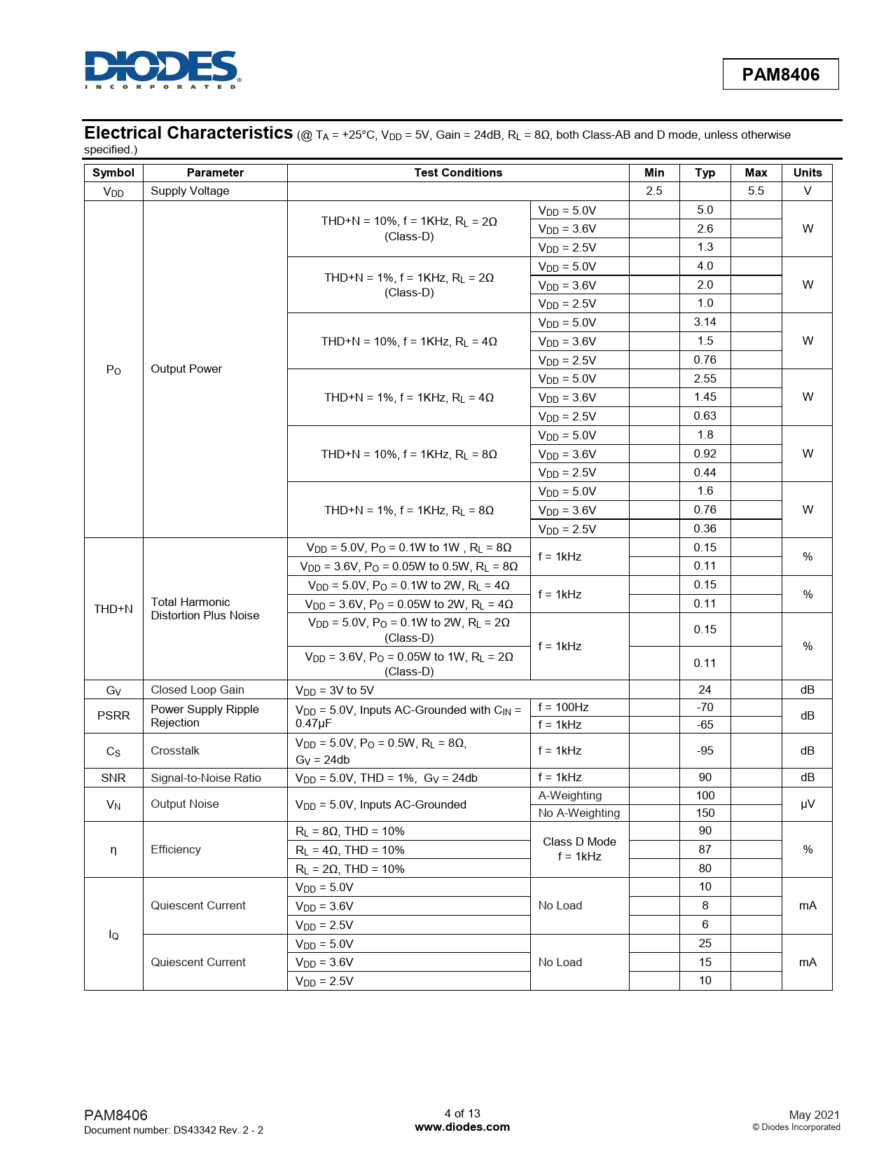 PAM8406. Electrical Characteristics. Symbol. Parameter. Test Conditions. Min. Typ. Max. Units. www.diodes.com
