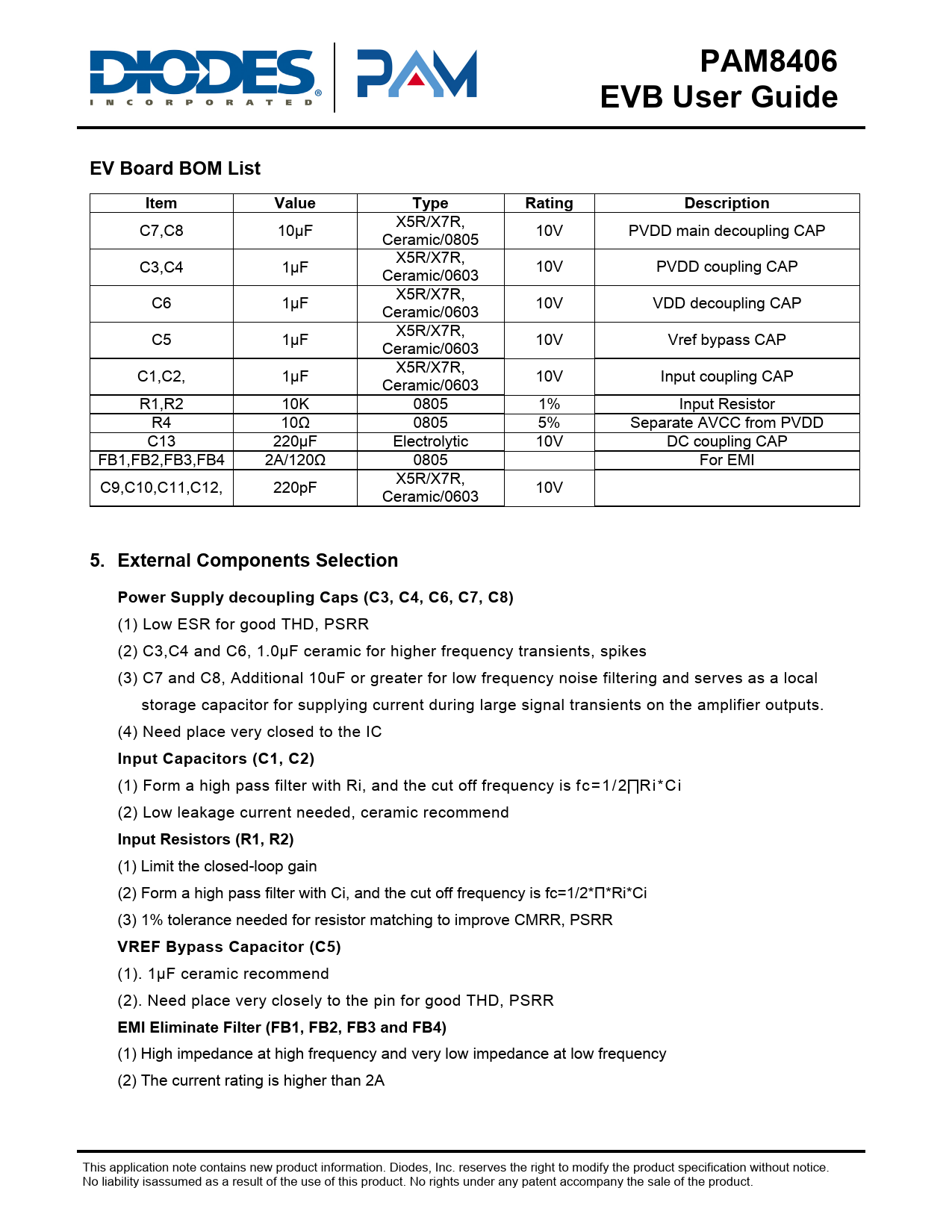 PAM8406EVB User GuideEV Board BOM ListItem Value TypeRating Description X5R/X7R, C7,C8 10µF 10V PVDD main decoupling CAP Ceramic/0805 X5R/X7R, C3,C4 1µF 10V PVDD coupling CAP Ceramic/0603 X5R/X7R, C6 1µF 10V VDD decoupling CAP Ceramic/0603 X5R/X7R, C5 1µF 10V Vref bypass CAP Ceramic/0603 X5R/X7R, C1,C2, 1µF 10V Input coupling CAP Ceramic/0603 R1,R2 10K 0805 1% Input Resistor R4 10Ω 0805 5% Separate AVCC from PVDD C13 220µF Electrolytic 10V DC coupling CAP FB1,FB2,FB3,FB4 2A/120Ω 0805 For EMI X5R/X7R, C9,C10,C11,C12, 220pF 10V Ceramic/0603 5. External Components SelectionPower Supply decoupling Caps (C3, C4, C6, C7, C8) (1) Low ESR for good THD, PSRR (2) C3,C4 and C6, 1.0µF ceramic for higher frequency transients, spikes (3) C7 and C8, Additional 10uF or greater for low frequency noise filtering and serves as a local storage capacitor for supplying current during large signal transients on the amplifier outputs. (4) Need place very closed to the IC Input Capacitors (C1, C2) (1) Form a high pass filter with Ri, and the cut off frequency is fc=1/2∏Ri*Ci (2) Low leakage current needed, ceramic recommend Input Resistors (R1, R2) (1) Limit the closed-loop gain (2) Form a high pass filter with Ci, and the cut off frequency is fc=1/2*Π*Ri*Ci (3) 1% tolerance needed for resistor matching to improve CMRR, PSRR VREF Bypass Capacitor (C5) (1). 1µF ceramic recommend (2). Need place very closely to the pin for good THD, PSRR EMI Eliminate Filter (FB1, FB2, FB3 and FB4) (1) High impedance at high frequency and very low impedance at low frequency (2) The current rating is higher than 2A This application note contains new product information. Diodes, Inc. reserves the right to modify the product specification without notice. No liability isassumed as a result of the use of this product. No rights under any patent accompany the sale of the product.