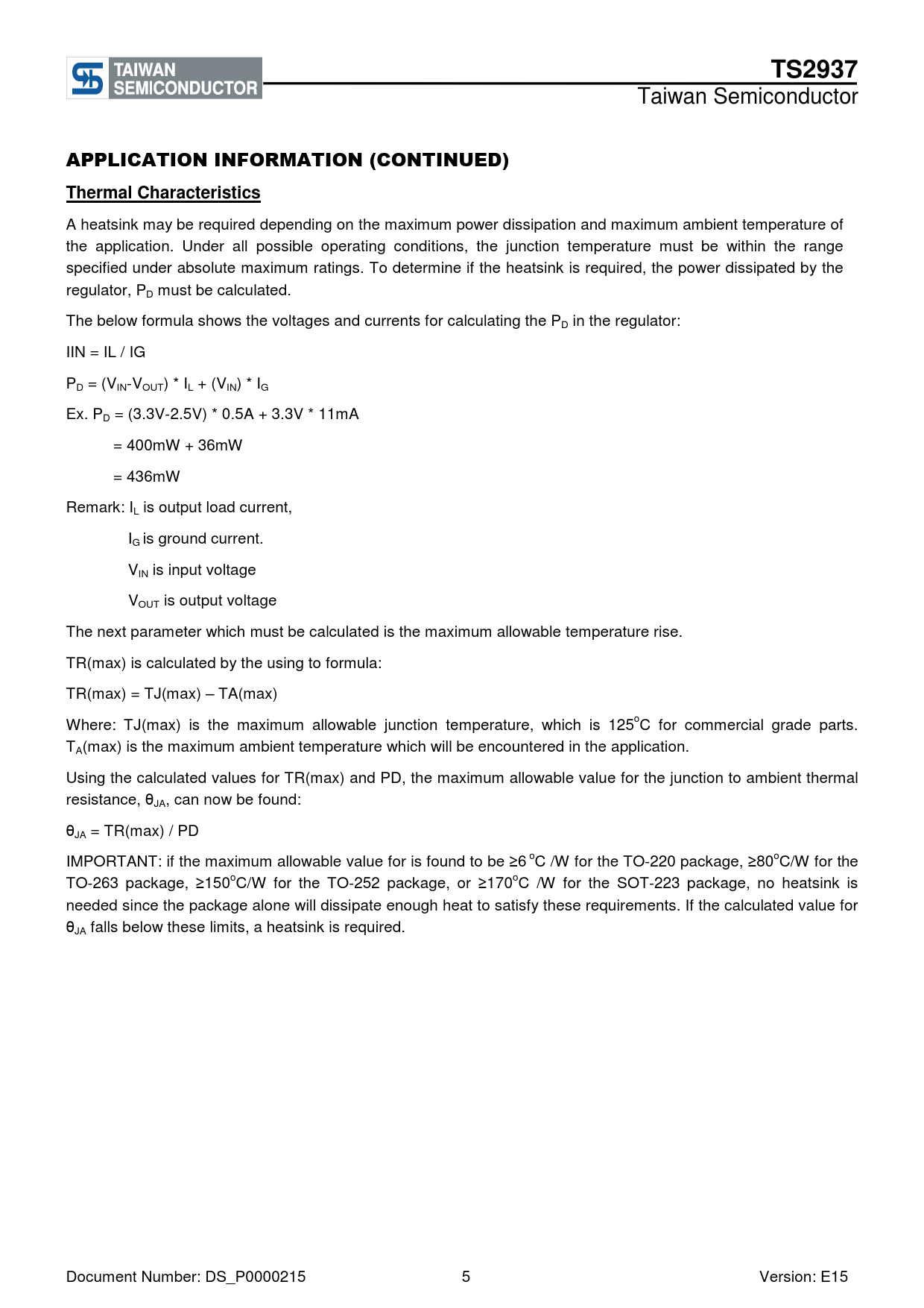 A heatsink may be required depending on the maximum power dissipation and maximum ambient temperature of the application. Under all possible operating conditions, the junction temperature must be within the range specified under absolute maximum ratings. To determine if the heatsink is required, the power dissipated by the regulator, PD must be calculated. The below formula shows the voltages and currents for calculating the PD in the regulator: IIN = IL / IG PD = (VIN-VOUT) * IL + (VIN) * IG Ex. PD = (3.3V-2.5V) * 0.5A + 3.3V * 11mA = 400mW + 36mW = 436mW Remark: IL is output load current, IG is ground current. VIN is input voltage VOUT is output voltage The next parameter which must be calculated is the maximum allowable temperature rise. TR(max) is calculated by the using to formula: TR(max) = TJ(max) – TA(max) Where: TJ(max) is the maximum allowable junction temperature, which is 125oC for commercial grade parts. TA(max) is the maximum ambient temperature which will be encountered in the application. Using the calculated values for TR(max) and PD, the maximum allowable value for the junction to ambient thermal resistance, θJA, can now be found: θJA = TR(max) / PD IMPORTANT: if the maximum allowable value for is found to be ≥6 oC /W for the TO-220 package, ≥80oC/W for the TO-263 package, ≥150oC/W for the TO-252 package, or ≥170oC /W for the SOT-223 package, no heatsink is needed since the package alone will dissipate enough heat to satisfy these requirements. If the calculated value for θJA falls below these limits, a heatsink is required. Document Number: DS_P0000215 5 Version: E15