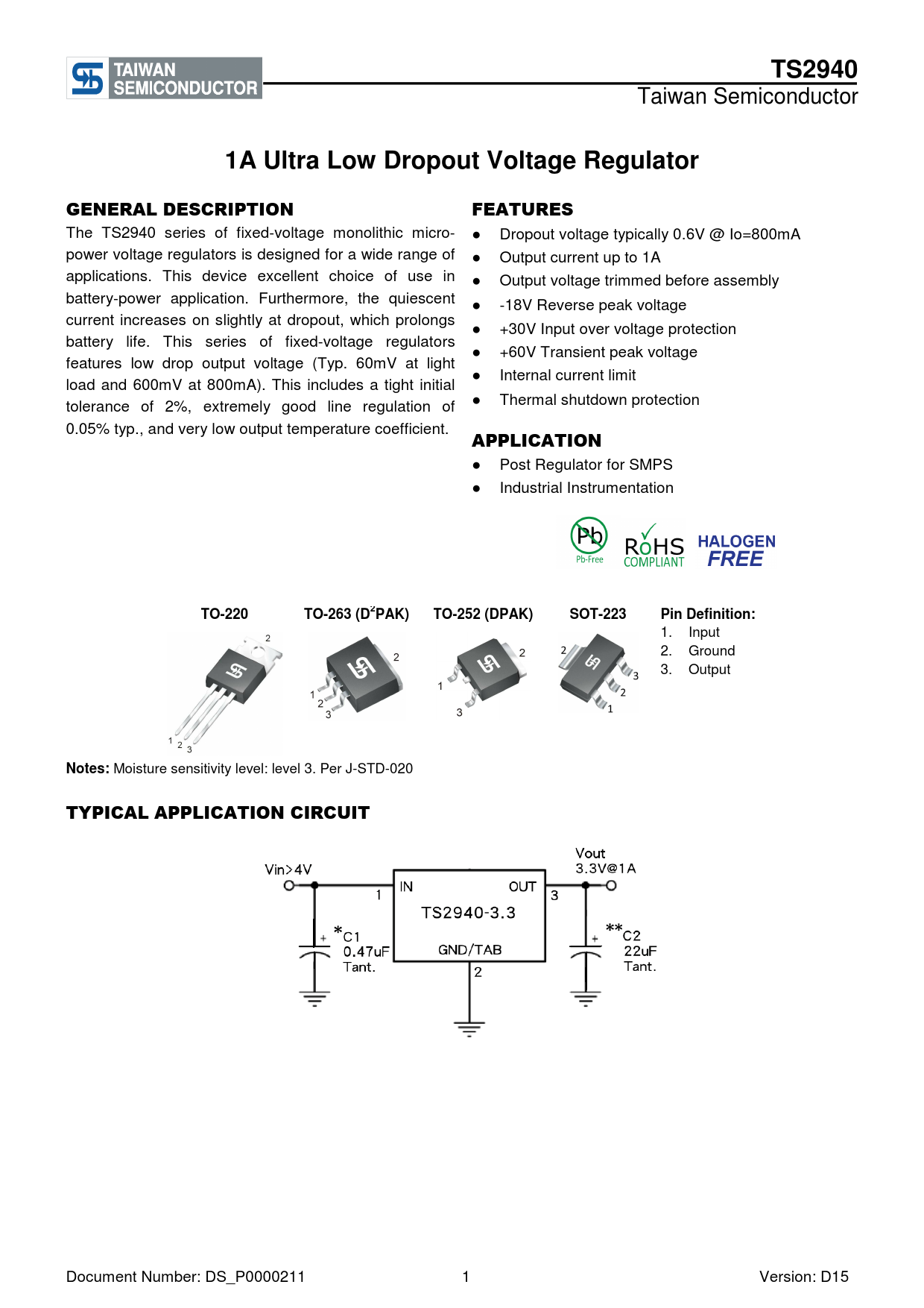 TS2940. 1A Ultra Low Dropout Voltage Regulator. TO-220. TO-263 (D2PAK). TO-252 (DPAK). SOT-223. Pin Definition:. Notes: