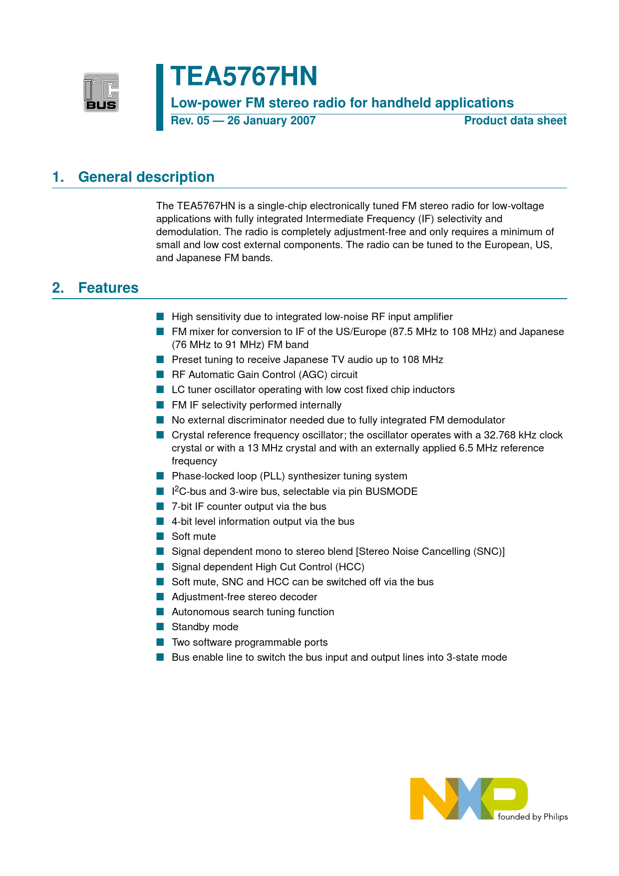 TEA5767HN Low-power FM stereo radio for handheld applications Rev. 05 — 26 January 2007 Product data sheet 1. General description