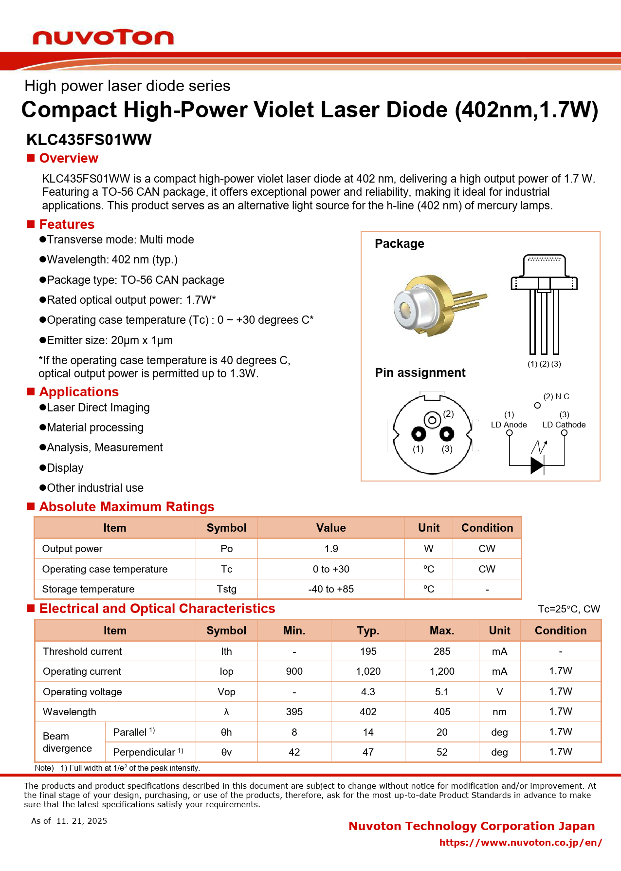 Compact High-Power Violet Laser Diode (402nm,1.7W) in TO-56 CAN package