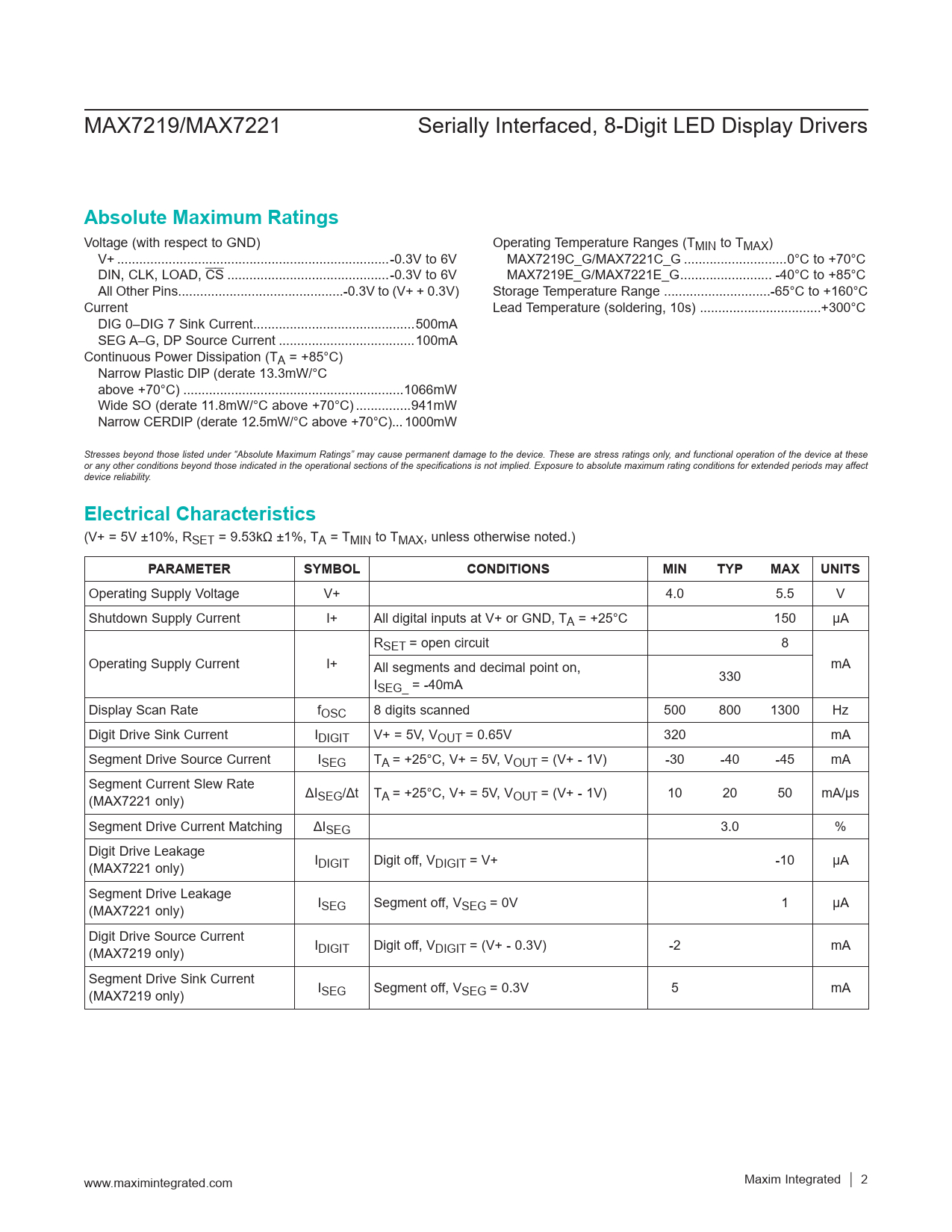 Voltage (with respect to GND) Operating Temperature Ranges (TMIN to TMAX) V+ ..-0.3V to 6V MAX7219C_G/MAX7221C_G ..0°C to +70°C DIN, CLK, LOAD, CS ..-0.3V to 6V MAX7219E_G/MAX7221E_G ... -40°C to +85°C All Other Pins...-0.3V to (V+ + 0.3V) Storage Temperature Range ...-65°C to +160°C Current Lead Temperature (soldering, 10s) ...+300°C DIG 0–DIG 7 Sink Current..500mA SEG A–G, DP Source Current ...100mA Continuous Power Dissipation (TA = +85°C) Narrow Plastic DIP (derate 13.3mW/°C above +70°C) ..1066mW Wide SO (derate 11.8mW/°C above +70°C) ...941mW Narrow CERDIP (derate 12.5mW/°C above +70°C) ... 1000mW Stresses beyond those listed under “Absolute Maximum Ratings” may cause permanent damage to the device. These are stress ratings only, and functional operation of the device at these or any other conditions beyond those indicated in the operational sections of the specifications is not implied. Exposure to absolute maximum rating conditions for extended periods may affect device reliability.