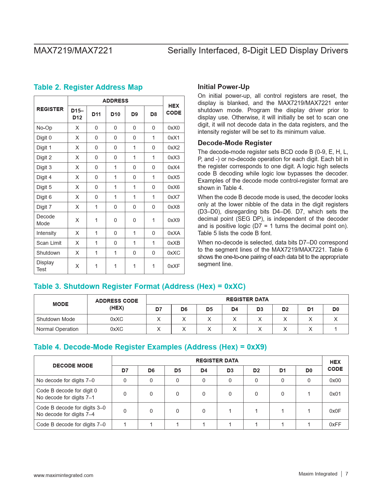 MAX7219/MAX7221 Serially Interfaced, 8-Digit LED Display Drivers Table 2. Register Address MapInitial Power-Up On initial power-up, all control registers are reset, the ADDRESS display is blanked, and the MAX7219/MAX7221 enter REGISTERHEXD15– shutdown mode. Program the display driver prior to CODED12D11D10D9D8 display use. Otherwise, it will initially be set to scan one digit, it will not decode data in the data registers, and the No-Op X 0 0 0 0 0xX0 intensity register will be set to its minimum value. Digit 0 X 0 0 0 1 0xX1 Decode-Mode Register Digit 1 X 0 0 1 0 0xX2 The decode-mode register sets BCD code B (0-9, E, H, L, Digit 2 X 0 0 1 1 0xX3 P, and -) or no-decode operation for each digit. Each bit in Digit 3 X 0 1 0 0 0xX4 the register corresponds to one digit. A logic high selects code B decoding while logic low bypasses the decoder. Digit 4 X 0 1 0 1 0xX5 Examples of the decode mode control-register format are Digit 5 X 0 1 1 0 0xX6 shown in Table 4. Digit 6 X 0 1 1 1 0xX7 When the code B decode mode is used, the decoder looks only at the lower nibble of the data in the digit registers Digit 7 X 1 0 0 0 0xX8 (D3–D0), disregarding bits D4–D6. D7, which sets the Decode decimal point (SEG DP), is independent of the decoder Mode X 1 0 0 1 0xX9 and is positive logic (D7 = 1 turns the decimal point on). Intensity X 1 0 1 0 0xXA Table 5 lists the code B font. Scan Limit X 1 0 1 1 0xXB When no-decode is selected, data bits D7–D0 correspond to the segment lines of the MAX7219/MAX7221. Table 6 Shutdown X 1 1 0 0 0xXC shows the one-to-one pairing of each data bit to the appropriate Display segment line. Test X 1 1 1 1 0xXF Table 3. Shutdown Register Format (Address (Hex) = 0xXC)REGISTER DATAMODEADDRESS CODE(HEX)D7D6D5D4D3D2D1D0 Shutdown Mode 0xXC X X X X X X X X Normal Operation 0xXC X X X X X X X 1 Table 4. Decode-Mode Register Examples (Address (Hex) = 0xX9)REGISTER DATADECODE MODEHEXCODED7D6D5D4D3D2D1D0 No decode for digits 7–0 0 0 0 0 0 0 0 0 0x00 Code B decode for digit 0 No decode for digits 7–1 0 0 0 0 0 0 0 1 0x01 Code B decode for digits 3–0 No decode for digits 7–4 0 0 0 0 1 1 1 1 0x0F Code B decode for digits 7–0 1 1 1 1 1 1 1 1 0xFF www.maximintegrated.com Maxim Integrated │ 7