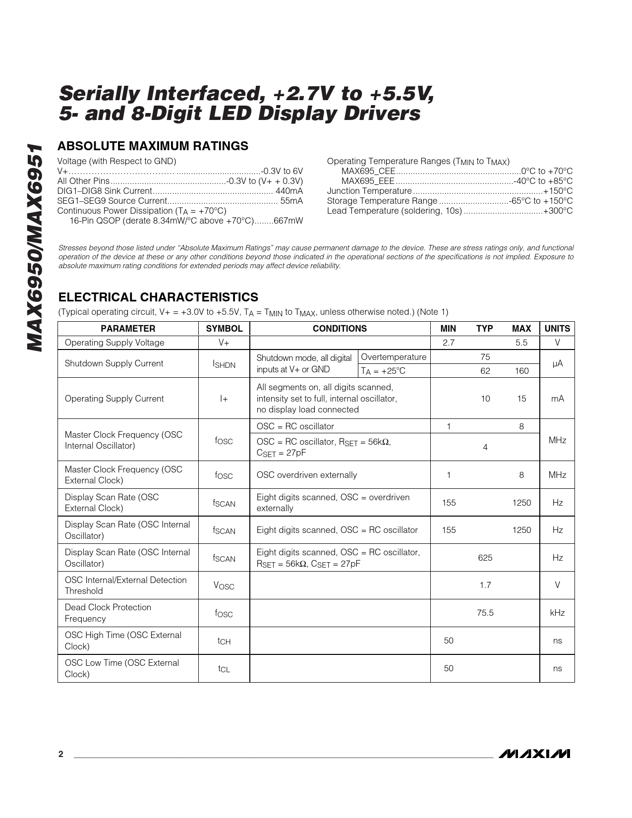Voltage (with Respect to GND) Operating Temperature Ranges (TMIN to TMAX) V+………………………………. ...-0.3V to 6V MAX695_CEE..0°C to +70°C All Other Pins..-0.3V to (V+ + 0.3V) MAX695_EEE ...-40°C to +85°C DIG1–DIG8 Sink Current.. 440mA Junction Temperature ..+150°C SEG1–SEG9 Source Current.. 55mA Storage Temperature Range ...-65°C to +150°C Continuous Power Dissipation (TA = +70°C) Lead Temperature (soldering, 10s) ...+300°C 16-Pin QSOP (derate 8.34mW/°C above +70°C)..667mW Stresses beyond those listed under “Absolute Maximum Ratings” may cause permanent damage to the device. These are stress ratings only, and functional operation of the device at these or any other conditions beyond those indicated in the operational sections of the specifications is not implied. Exposure to absolute maximum rating conditions for extended periods may affect device reliability.