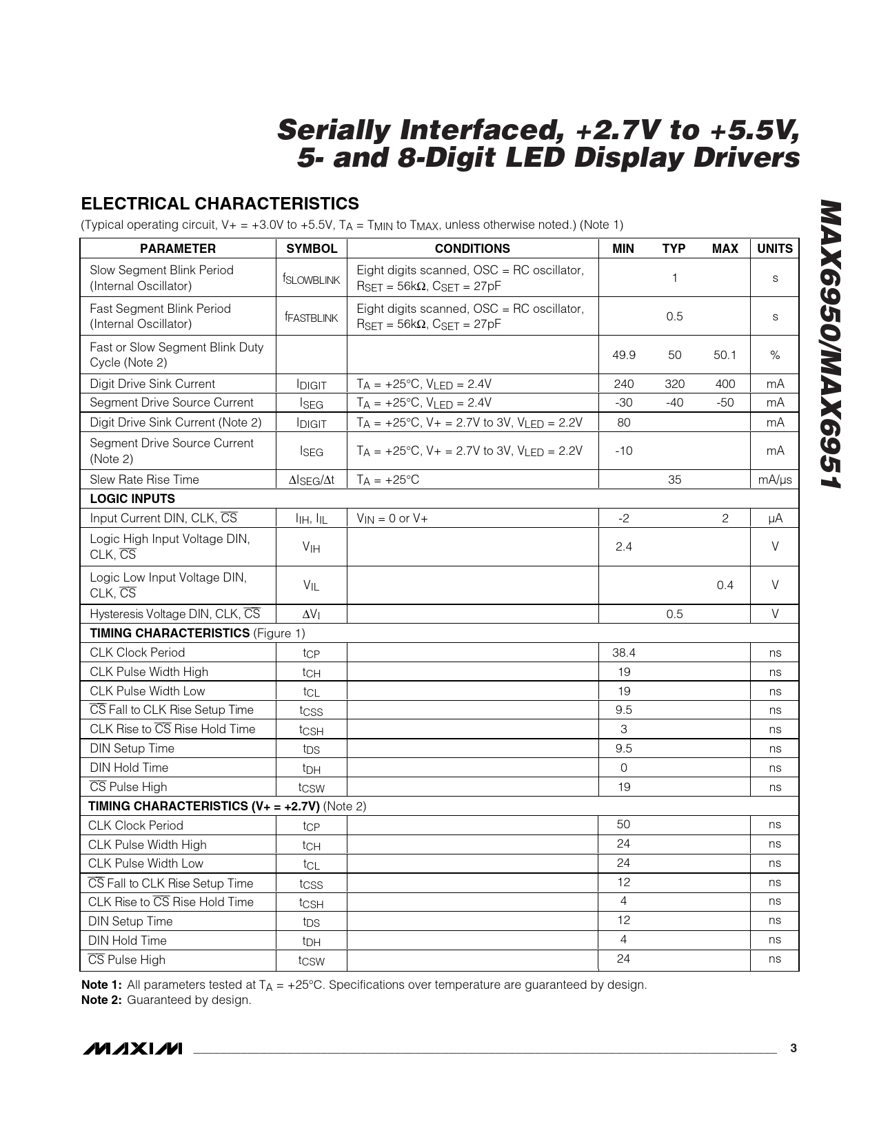 Serially Interfaced, +2.7V to +5.5V,5- and 8-Digit LED Display DriversMAX6950/MAX6951ELECTRICAL CHARACTERISTICS (Typical operating circuit, V+ = +3.0V to +5.5V, TA = TMIN to TMAX, unless otherwise noted.) (Note 1) PARAMETERSYMBOLCONDITIONSMINTYPMAXUNITS Slow Segment Blink Period Eight digits scanned, OSC = RC oscillator, fS LOWBLIN K 1 s (Internal Oscillator) RSET = 56kΩ, CSET = 27pF Fast Segment Blink Period Eight digits scanned, OSC = RC oscillator, fFASTBLIN K 0.5 s (Internal Oscillator) RSET = 56kΩ, CSET = 27pF Fast or Slow Segment Blink Duty 49.9 50 50.1 % Cycle (Note 2) Digit Drive Sink Current IDIGIT TA = +25°C, VLED = 2.4V 240 320 400 mA Segment Drive Source Current ISEG TA = +25°C, VLED = 2.4V -30 -40 -50 mA Digit Drive Sink Current (Note 2) IDIGIT TA = +25°C, V+ = 2.7V to 3V, VLED = 2.2V 80 mA Segment Drive Source Current ISEG TA = +25°C, V+ = 2.7V to 3V, VLED = 2.2V -10 mA (Note 2) Slew Rate Rise Time ∆ISEG/∆t TA = +25°C 35 mA/µs LOGIC INPUTS Input Current DIN, CLK, CS IIH, IIL VIN = 0 or V+ -2 2 µA Logic High Input Voltage DIN, VIH 2.4 V CLK, CS Logic Low Input Voltage DIN, VIL 0.4 V CLK, CS H yster esi s V ol tag e D IN , C LK, C S ∆VI 0.5 V TIMING CHARACTERISTICS (Figure 1) CLK Clock Period tCP 38.4 ns CLK Pulse Width High tCH 19 ns CLK Pulse Width Low tCL 19 ns C S Fall to CLK Ri se S etup Ti m e tCSS 9.5 ns CLK Ri se to CS Rise Hold Time tCSH 3 ns DIN Setup Time tDS 9.5 ns DIN Hold Time tDH 0 ns CS Pulse High tCSW 19 ns TIMING CHARACTERISTICS (V+ = +2.7V) (Note 2) CLK Clock Period tCP 50 ns CLK Pulse Width High tCH 24 ns CLK Pulse Width Low tCL 24 ns C S Fall to CLK Ri se Setup Time tCSS 12 ns CLK Ri se to CS Rise Hold Time tCSH 4 ns DIN Setup Time tDS 12 ns DIN Hold Time tDH 4 ns CS Pulse High tCSW 24 ns Note 1: All parameters tested at TA = +25°C. Specifications over temperature are guaranteed by design. Note 2: Guaranteed by design. _______________________________________________________________________________________3