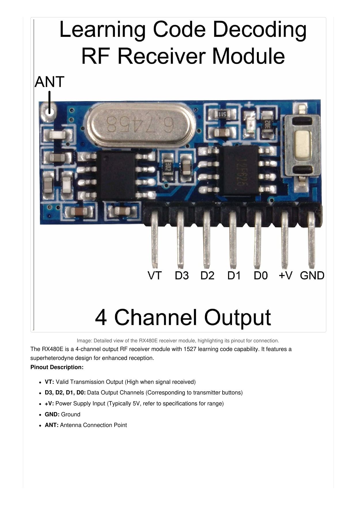 Image: Detailed view of the RX480E receiver module, highlighting its pinout for connection. The RX480E is a 4-channel output RF receiver module with 1527 learning code capability. It features a superheterodyne design for enhanced reception. Pinout Description:VT: Valid Transmission Output (High when signal received) D3, D2, D1, D0: Data Output Channels (Corresponding to transmitter buttons) +V: Power Supply Input (Typically 5V, refer to specifications for range) GND: Ground ANT: Antenna Connection Point Document Outline QIACHIP RX480E+TX118SA 3SETS QIACHIP 433MHz RF Transmitter and Receiver Module Instruction Manual 1. Product Overview 2. Component Identification and Specifications 2.1. RX480E Receiver Module 2.2. TX118SA Transmitter Module 3. Setup and Wiring 3.1. Basic Connection Diagram 3.2. Power Supply and Antenna 4. Operating Modes and Pairing 4.1. Learning Button Usage 4.2. Mode Descriptions 4.3. Pairing Process 5. Troubleshooting 6. Specifications 7. Maintenance and Care 8. Warranty and Support