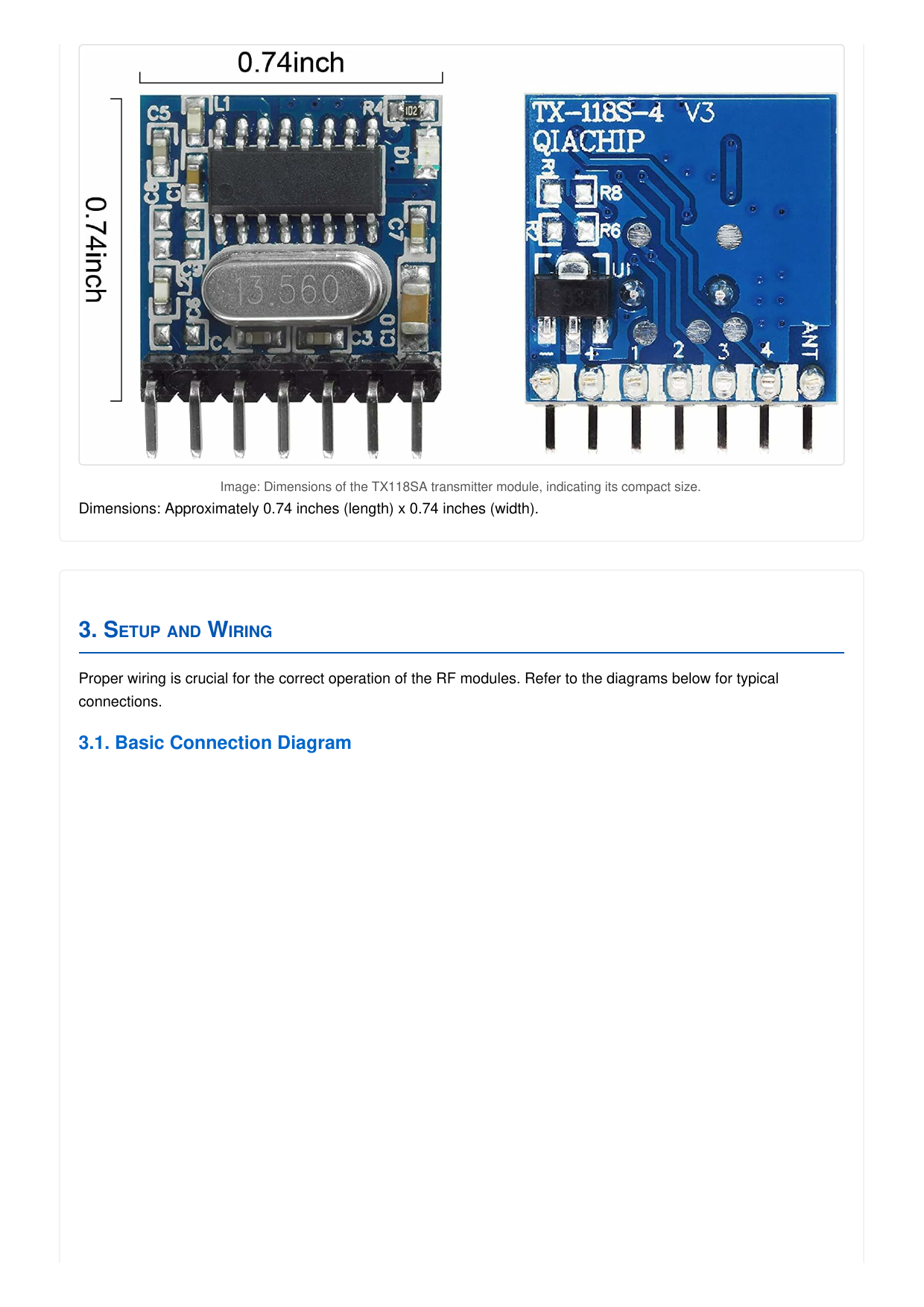 Document Outline QIACHIP RX480E+TX118SA 3SETS QIACHIP 433MHz RF Transmitter and Receiver Module Instruction Manual 1. Product Overview 2. Component Identification and Specifications 2.1. RX480E Receiver Module 2.2. TX118SA Transmitter Module 3. Setup and Wiring 3.1. Basic Connection Diagram 3.2. Power Supply and Antenna 4. Operating Modes and Pairing 4.1. Learning Button Usage 4.2. Mode Descriptions 4.3. Pairing Process 5. Troubleshooting 6. Specifications 7. Maintenance and Care 8. Warranty and Support