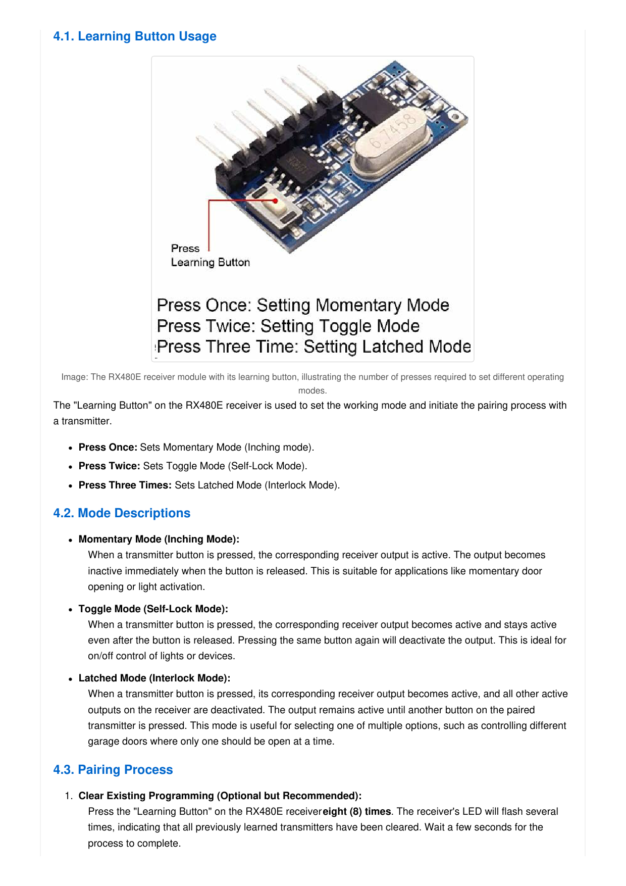 Image: The RX480E receiver module with its learning button, illustrating the number of presses required to set different operating modes. The "Learning Button" on the RX480E receiver is used to set the working mode and initiate the pairing process with a transmitter.