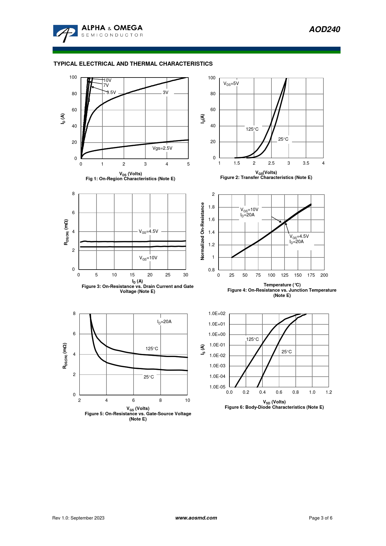 AOD240TYPICAL ELECTRICAL AND THERMAL CHARACTERISTICS 100 100 10V V =5V DS 7V 80 3.5V 3V 80 60 60 ))AA((I DI D 40 40 125°C 25°C 20 20 Vgs=2.5V 0 0 0 1 2 3 4 5 1 1.5 2 2.5 3 3.5 4 V(Volts)V(Volts)GSDSFigure 2: Transfer Characteristics (Note E)Fig 1: On-Region Characteristics (Note E) 8 2 1.8 nce V =10V 6 at GS si I =20A D ) W s 1.6 e R- 17 (m ) 4 V =4.5V GS 1.4 OnON 5 (d V =4.5V S GS De z I =20A 2 Ril 1.2 D a 10 2 m or V =10V 1 GS N 0 0.8 0 5 10 15 20 25 30 0 25 50 75 100 125 150 175 200 I (A)DTemperature (°C) 0 Figure 3: On-Resistance vs. Drain Current and GateVoltage (Note E)Figure 4: On-Resistance vs. Juncti 18 on Temperature(Note E) 8 1.0E+02 I =20A D 1.0E+01 6 40 1.0E+00 125°C )) 1.0E-01 W A 125°C ((m ) 4 I S 25°C 1.0E-02 N O( S D 1.0E-03 R 2 25°C 1.0E-04 1.0E-05 0.0 0.2 0.4 0.6 0.8 1.0 1.2 0 2 4 6 8 10 V(Volts)SDFigure 6: Body-Diode Characteristics (Note E)V(Volts)GSFigure 5: On-Resistance vs. Gate-Source Voltage(Note E) Rev 1.0: September 2023 www.aosmd.com Page 3 of 6