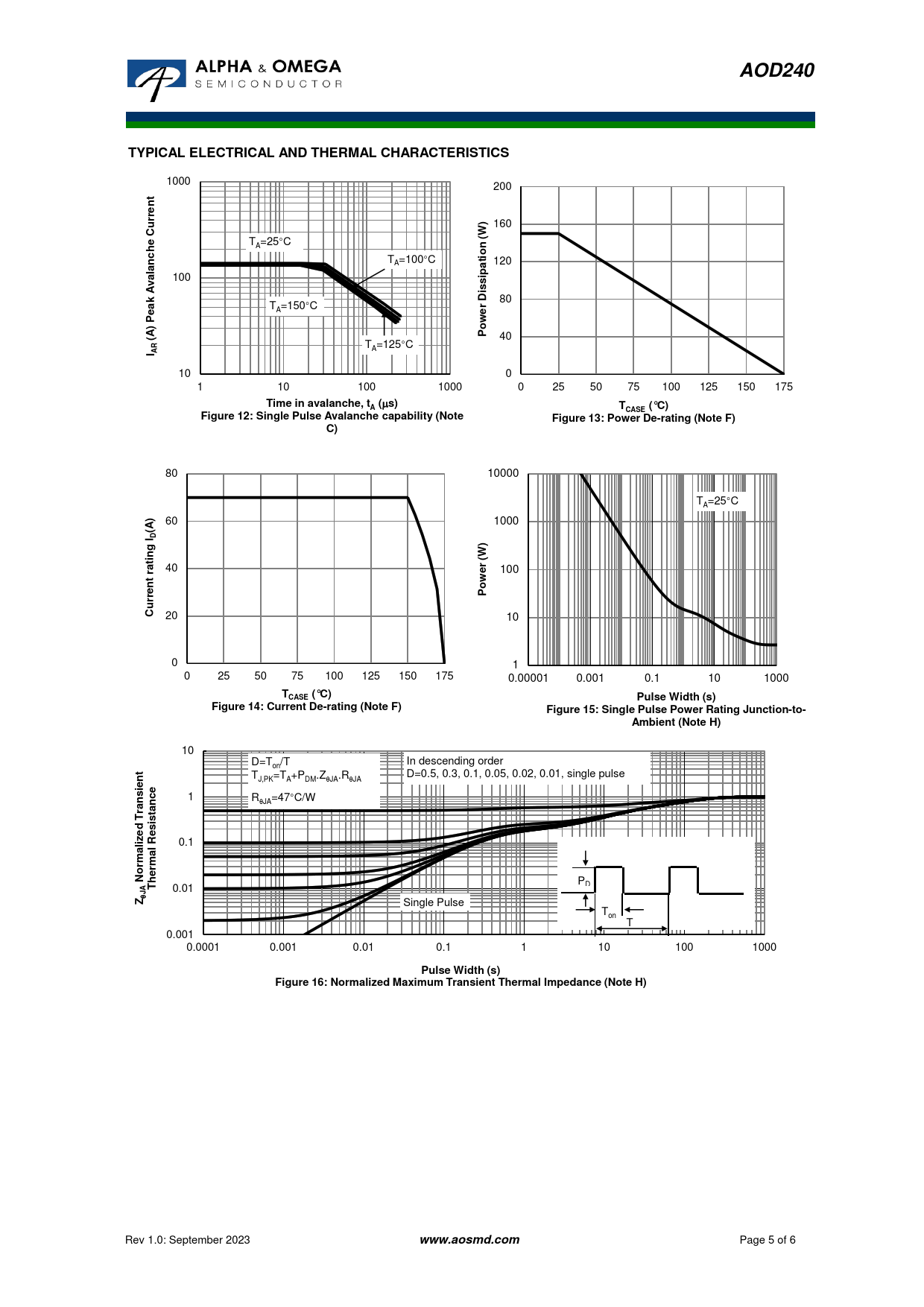 AOD240TYPICAL ELECTRICAL AND THERMAL CHARACTERISTICS 1000 200 rent)ur 160 CW( T =25°C A oninche T =100°C A 120 alpatia 100 svsAikD 80 a T =150°C re A eP )owAP( 40 R T =125°C I A A 10 0 1 10 100 1000 0 25 50 75 100 125 150 175 Time in avalanche, t ( m s)AT(°C)CASEFigure 12: Single Pulse Avalanche capability (NoteFigure 13: Power De-rating (Note F)C) 80 10000 T =25°C A ) 60 A 1000 ( I D) 17 ng iWt( 5 40 rrae 100 2 ntowreP 10 ur C 20 10 0 1 0 25 50 75 100 125 150 175 0.00001 0.001 0.1 10 0 1000 T(°C)CASEPulse Width (s) 18 Figure 14: Current De-rating (Note F)Figure 15: Single Pulse Power Rating Junction-to-Ambient (Note H) 10 D=T /T In descending order on nt T =T +P .Z .R D=0.5, 0.3, 0.1, 0.05, 0.02, 0.01, single pulse J,PK A DM qJA qJA ei e 1 ns Rq =47°C/W JA 40 ncraatTsidse zeil R 0.1 al am orrmNhe P T 0.01 D JA q Z Single Pulse Ton T 0.001 0.0001 0.001 0.01 0.1 1 10 100 1000 Pulse Width (s)Figure 16: Normalized Maximum Transient Thermal Impedance (Note H) Rev 1.0: September 2023 www.aosmd.com Page 5 of 6
