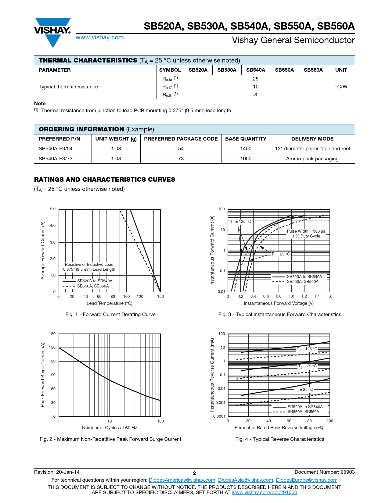 SB520A, SB530A, SB540A, SB550A, SB560A www.vishay.com Vishay General Semiconductor THERMAL CHARACTERISTICS (TA = 25 °C unless otherwise noted) PARAMETERSYMBOLSB520ASB530ASB540ASB550ASB560AUNIT RJA (1) 25 Typical thermal resistance RJC (1) 10 °C/W RJL (1) 8 Note (1) Thermal resistance from junction to lead PCB mounting 0.375" (9.5 mm) lead length ORDERING INFORMATION (Example) PREFERRED P/NUNIT WEIGHT (g)PREFERRED PACKAGE CODEBASE QUANTITYDELIVERY MODE SB540A-E3/54 1.08 54 1400 13" diameter paper tape and reel SB540A-E3/73 1.08 73 1000 Ammo pack packaging RATINGS AND CHARACTERISTICS CURVES (TA = 25 °C unless otherwise noted) 5.0 100 T = 125 °C J 4.0 ent (A) 10 ent (A) Pulse Width = 300 μs 1 % Duty Cycle d Curr 3.0 d Curr 1 Forwar T = 25 °C J 2.0 s Resistive or Inductive Load 0.375" (9.5 mm) Lead Length 0.1 verage Forwar 1.0 A tantaneou SB520A to SB540A SB520A to SB540A s SB550A, SB560A In SB550A, SB560A 0 0.01 0 20 40 60 80 100 120 150 0 0.2 0.4 0.6 0.8 1.0 1.2 1.4 1.6 Lead Temperature (°C) Instantaneous Forward Voltage (V) Fig. 1 - Forward Current Derating Curve Fig. 3 - Typical Instantaneous Forward Characteristics 180 100 150 10 T = 125 °C J ent (A) ent (mA) 120 1 e Curr T = 75 °C ge Curr s J ur 90 S 0.1 d Rever s 60 0.01 T = 25 °C J 30 0.001 Peak Forwar tantaneou s SB520A to SB540A In SB550A, SB560A 0 0.0001 1 10 100 0 20 40 60 80 100 Number of Cycles at 60 Hz Percent of Rated Peak Reverse Voltage (%) Fig. 2 - Maximum Non-Repetitive Peak Forward Surge Current Fig. 4 - Typical Reverse Characteristics Revision: 20-Jan-14 2 Document Number: 88903 For technical questions within your region: DiodesAmericas@vishay.com, DiodesAsia@vishay.com, DiodesEurope@vishay.com THIS DOCUMENT IS SUBJECT TO CHANGE WITHOUT NOTICE. THE PRODUCTS DESCRIBED HEREIN AND THIS DOCUMENT ARE SUBJECT TO SPECIFIC DISCLAIMERS, SET FORTH AT www.vishay.com/doc?91000