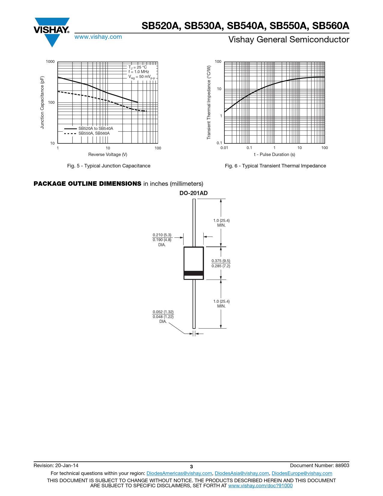SB520A, SB530A, SB540A, SB550A, SB560A www.vishay.com Vishay General Semiconductor 1000 100 T = 25 °C J f = 1.0 MHz V = 50 mV sig p-p 10 100 1 Junction Capacitance (pF) SB520A to SB540A ient Thermal Impedance (°C/W) s SB550A, SB560A n a Tr 10 0.1 1 10 100 0.01 0.1 1 10 100 Reverse Voltage (V) t - Pulse Duration (s) Fig. 5 - Typical Junction Capacitance Fig. 6 - Typical Transient Thermal Impedance PACKAGE OUTLINE DIMENSIONS in inches (millimeters) DO-201AD 1.0 (25.4) MIN. 0.210 (5.3) 0.190 (4.8) DIA. 0.375 (9.5) 0.285 (7.2) 1.0 (25.4) MIN. 0.052 (1.32) 0.048 (1.22) DIA. Revision: 20-Jan-14 3 Document Number: 88903 For technical questions within your region: DiodesAmericas@vishay.com, DiodesAsia@vishay.com, DiodesEurope@vishay.com THIS DOCUMENT IS SUBJECT TO CHANGE WITHOUT NOTICE. THE PRODUCTS DESCRIBED HEREIN AND THIS DOCUMENT ARE SUBJECT TO SPECIFIC DISCLAIMERS, SET FORTH AT www.vishay.com/doc?91000