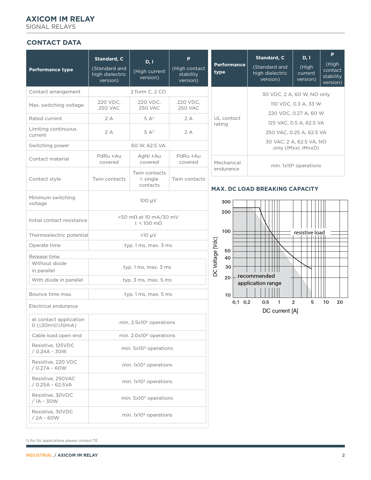 IM Relay AXICOM IM RELAY CONTACT DATA Standard, C D, I Perf ormance Performance type type MAX DC LOAD BREAKING CAPACITY