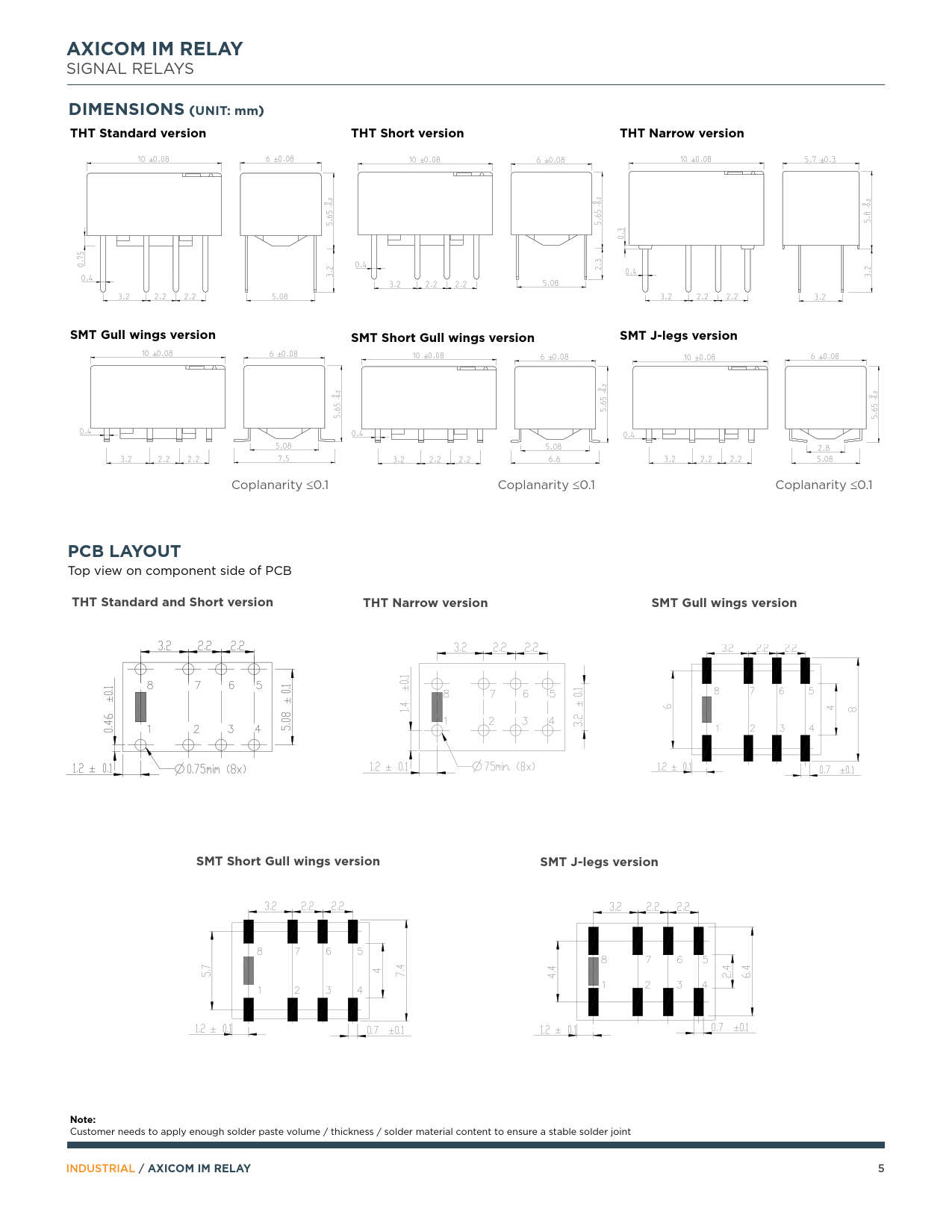 AXICOM IM RELAY SIGNAL RELAYS DIMENSIONS (UNIT: mm)THT Standard versionTHT Short versionTHT Narrow versionSMT Gull wings versionSMT Short Gull wings versionSMT J-legs version Coplanarity ≤0.1 Coplanarity ≤0.1 Coplanarity ≤0.1 PCB LAYOUT Top view on component side of PCB THT Standard and Short versionTHT Narrow versionSMT Gull wings versionSMT Short Gull wings versionSMT J-legs versionNote: Customer needs to apply enough solder paste volume / thickness / solder material content to ensure a stable solder joint INDUSTRIAL / AXICOM IM RELAY 5 Document Outline Introduction Features Applications Approvals Contact Data Max. DC load breaking capacity Coil Data Coil versions, standard version, monostable, 1 coil Coil operating range, standard version, monostable, 1 coil Coil versions, sensitive version, monostable, 1 coil Coil versions, ultra high sensitive version, monostable, 1 coil Coil operating range, sensitive and ultra high sensitive version, monostable, 1 coil Coil versions, standard version, bistable 1 coil Coil operating range, Standard version, bistable, 1 coil Insulation Data Other Data Monostable version rest condition Bistable version, 1 coil reset condition RF data Dimensions PCB layout Processing Packing Product code structure Product Selection Information