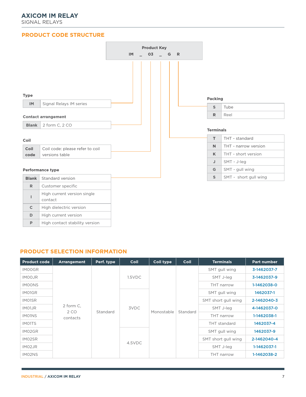 IM00GR SMT gull wing 3-1462037-7 IM00JR 1.5VDC SMT J-leg 3-1462037-9 IM00NS THT narrow 1-1462038-0 IM01GR SMT gull wing 1462037-1 IM01SR SMT short gull wing 2-1462040-3 2 form C, IM01JR 3VDC SMT J-leg 4-1462037-0 2 CO Standard Monostable Standard IM01NS contacts THT narrow 1-1462038-1 IM01TS THT standard 1462037-4 IM02GR SMT gull wing 1462037-9 IM02SR SMT short gull wing 2-1462040-4 4.5VDC IM02JR SMT J-leg 1-1462037-1 IM02NS THT narrow 1-1462038-2 INDUSTRIAL /
