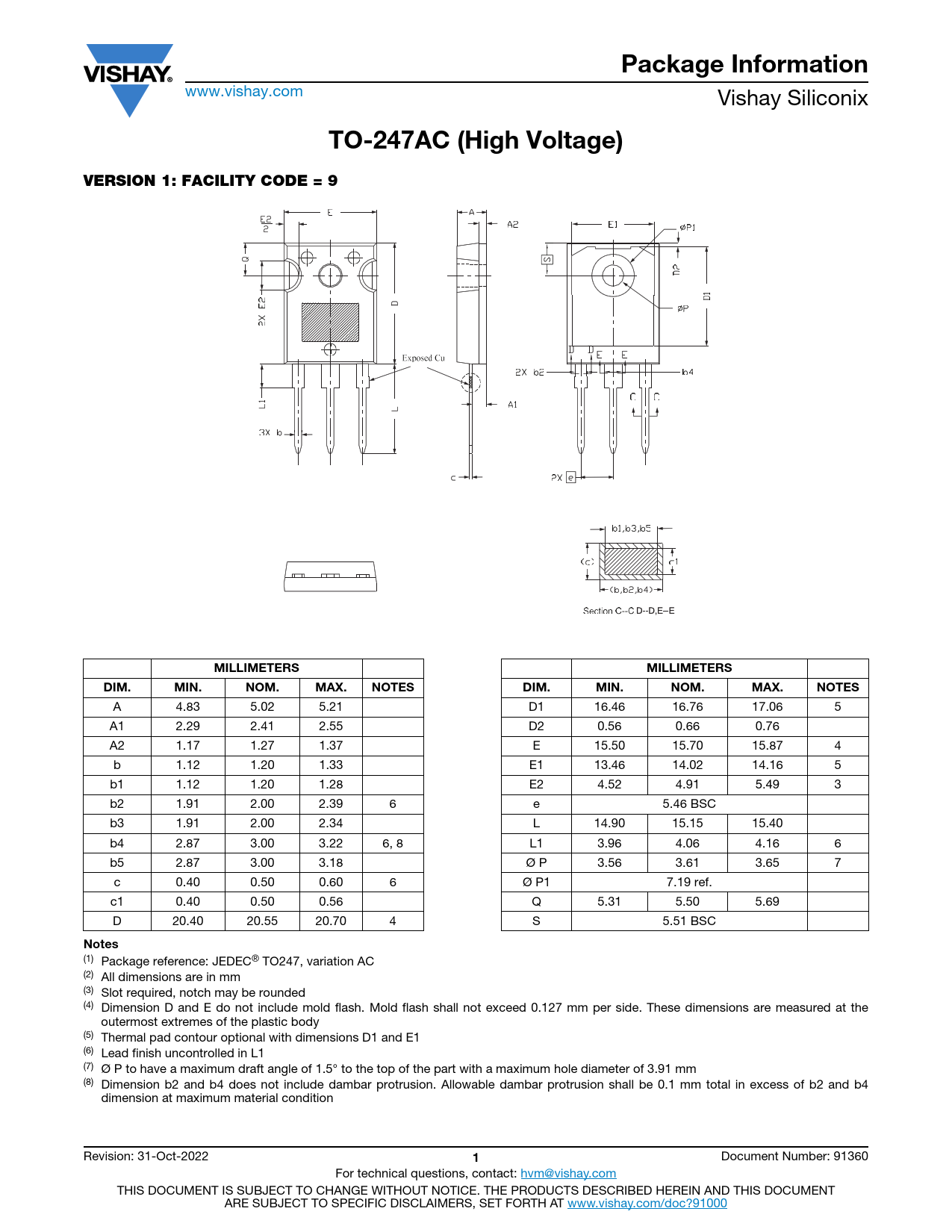 Package Information. TO-247AC (High Voltage). VERSION 1: FACILITY CODE = 9. MILLIMETERS. DIM. MIN. NOM. MAX. NOTES. Notes