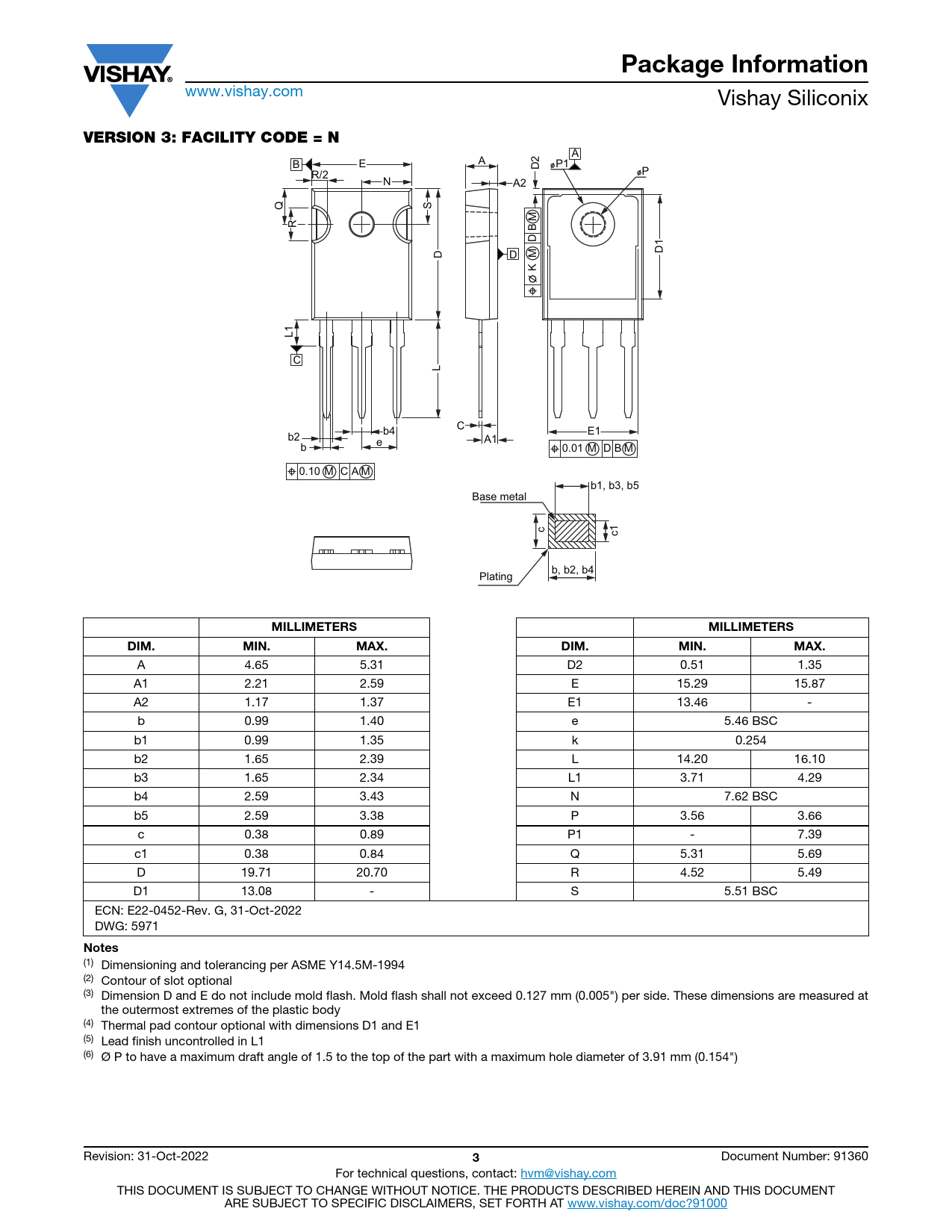 Package Information www.vishay.com Vishay Siliconix VERSION 3: FACILITY CODE = N A A B E P1 D2 P R/2 N A2 Q S M R DB D1 D D M K L1 C L C b4 E1 b2 A1 b e 0.01 M D B M 0.10 M C A M b1, b3, b5 Base metal c c1 b, b2, b4 Plating MILLIMETERSMILLIMETERSDIM.MIN.MAX.DIM.MIN.MAX. A 4.65 5.31 D2 0.51 1.35 A1 2.21 2.59 E 15.29 15.87 A2 1.17 1.37 E1 13.46 - b 0.99 1.40 e 5.46 BSC b1 0.99 1.35 k 0.254 b2 1.65 2.39 L 14.20 16.10 b3 1.65 2.34 L1 3.71 4.29 b4 2.59 3.43 N 7.62 BSC b5 2.59 3.38 P 3.56 3.66 c 0.38 0.89 P1 - 7.39 c1 0.38 0.84 Q 5.31 5.69 D 19.71 20.70 R 4.52 5.49 D1 13.08 - S 5.51 BSC ECN: E22-0452-Rev. G, 31-Oct-2022 DWG: 5971 Notes (1) Dimensioning and tolerancing per ASME Y14.5M-1994 (2) Contour of slot optional (3) Dimension D and E do not include mold flash. Mold flash shall not exceed 0.127 mm (0.005") per side. These dimensions are measured at the outermost extremes of the plastic body (4) Thermal pad contour optional with dimensions D1 and E1 (5) Lead finish uncontrolled in L1 (6) Ø P to have a maximum draft angle of 1.5 to the top of the part with a maximum hole diameter of 3.91 mm (0.154") Revision: 31-Oct-2022 3 Document Number: 91360 For technical questions, contact: hvm@vishay.com THIS DOCUMENT IS SUBJECT TO CHANGE WITHOUT NOTICE. THE PRODUCTS DESCRIBED HEREIN AND THIS DOCUMENT ARE SUBJECT TO SPECIFIC DISCLAIMERS, SET FORTH AT www.vishay.com/doc?91000