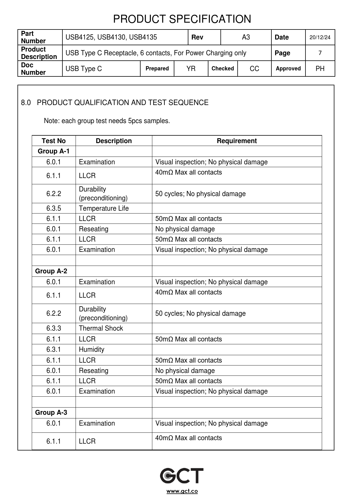 PRODUCT SPECIFICATION Part USB4125, USB4130, USB4135 Rev A3 Date 20/12/24 Number Product USB Type C Receptacle, 6 contacts, For Power Charging only Page 7 Description Doc USB Type C Prepared YR Checked CC Approved PH Number 8.0 PRODUCT QUALIFICATION AND TEST SEQUENCE Note: each group test needs 5pcs samples. Test NoDescriptionRequirementGroup A-1 6.0.1 Examination Visual inspection; No physical damage 40mΩ Max all contacts 6.1.1 LLCR Durability 6.2.2 50 cycles; No physical damage (preconditioning) 6.3.5 Temperature Life 6.1.1 LLCR 50mΩ Max all contacts 6.0.1 Reseating No physical damage 6.1.1 LLCR 50mΩ Max all contacts 6.0.1 Examination Visual inspection; No physical damage Group A-2 6.0.1 Examination Visual inspection; No physical damage 40mΩ Max all contacts 6.1.1 LLCR Durability 6.2.2 50 cycles; No physical damage (preconditioning) 6.3.3 Thermal Shock 6.1.1 LLCR 50mΩ Max all contacts 6.3.1 Humidity 6.1.1 LLCR 50mΩ Max all contacts 6.0.1 Reseating No physical damage 6.1.1 LLCR 50mΩ Max all contacts 6.0.1 Examination Visual inspection; No physical damage Group A-3 6.0.1 Examination Visual inspection; No physical damage 40mΩ Max all contacts 6.1.1 LLCR www.gct.co