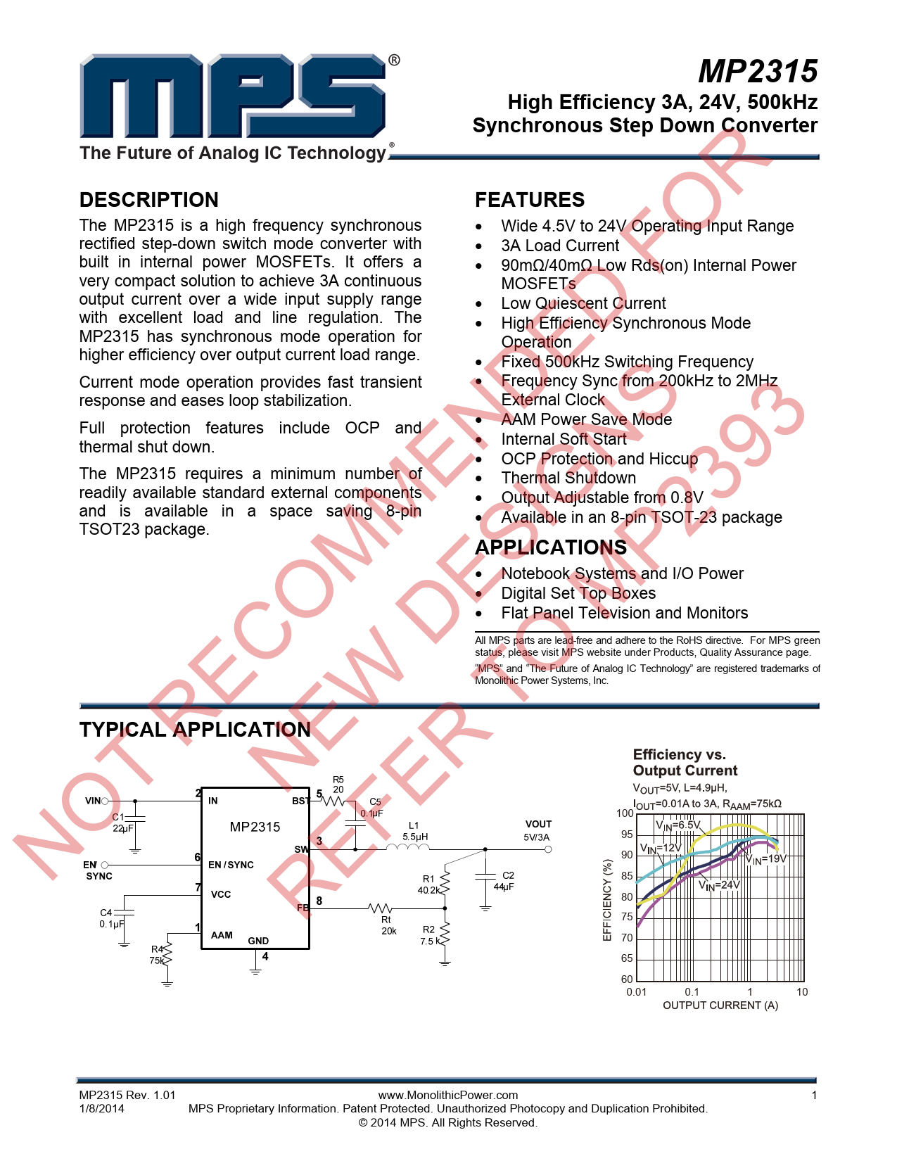 RECOMMENDED FOR NEW DESIGNS 100 95 90 NOT 85 80 REFER T 7570 65 60 0.01 0.1 1 10 MP2315 Rev. 1.01 www.MonolithicPower.com 1 1/8/2014 MPS Proprietary Information. Patent Protected. Unauthorized Photocopy and Duplication Prohibited. © 2014 MPS. All Rights Reserved.