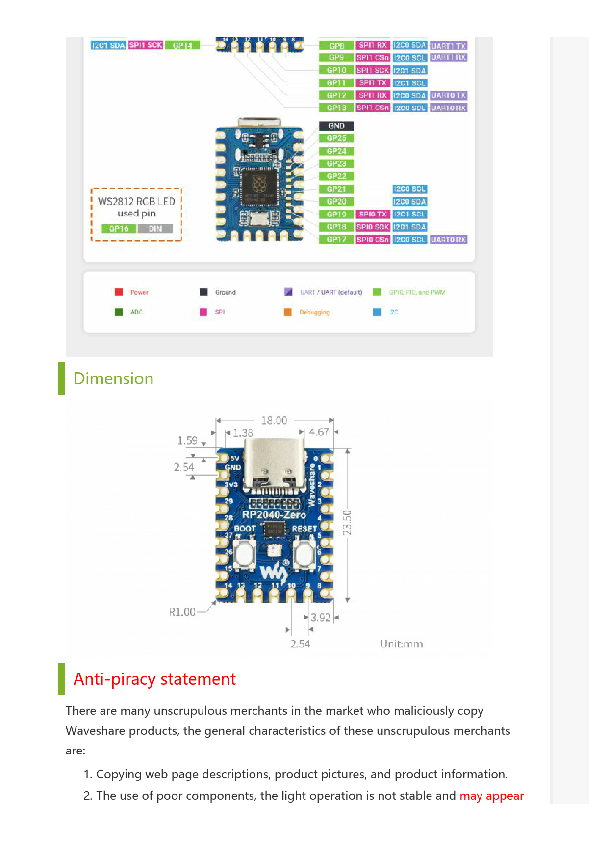 Dimension Anti-piracy statement There are many unscrupulous merchants in the market who maliciously copy Waveshare products, the general characteristics of these unscrupulous merchants are:  1. Copying web page descriptions, product pictures, and product information. 2. The use of poor components, the light operation is not stable and may appear short circuit, equipment burned, and other phenomena (to avoid your