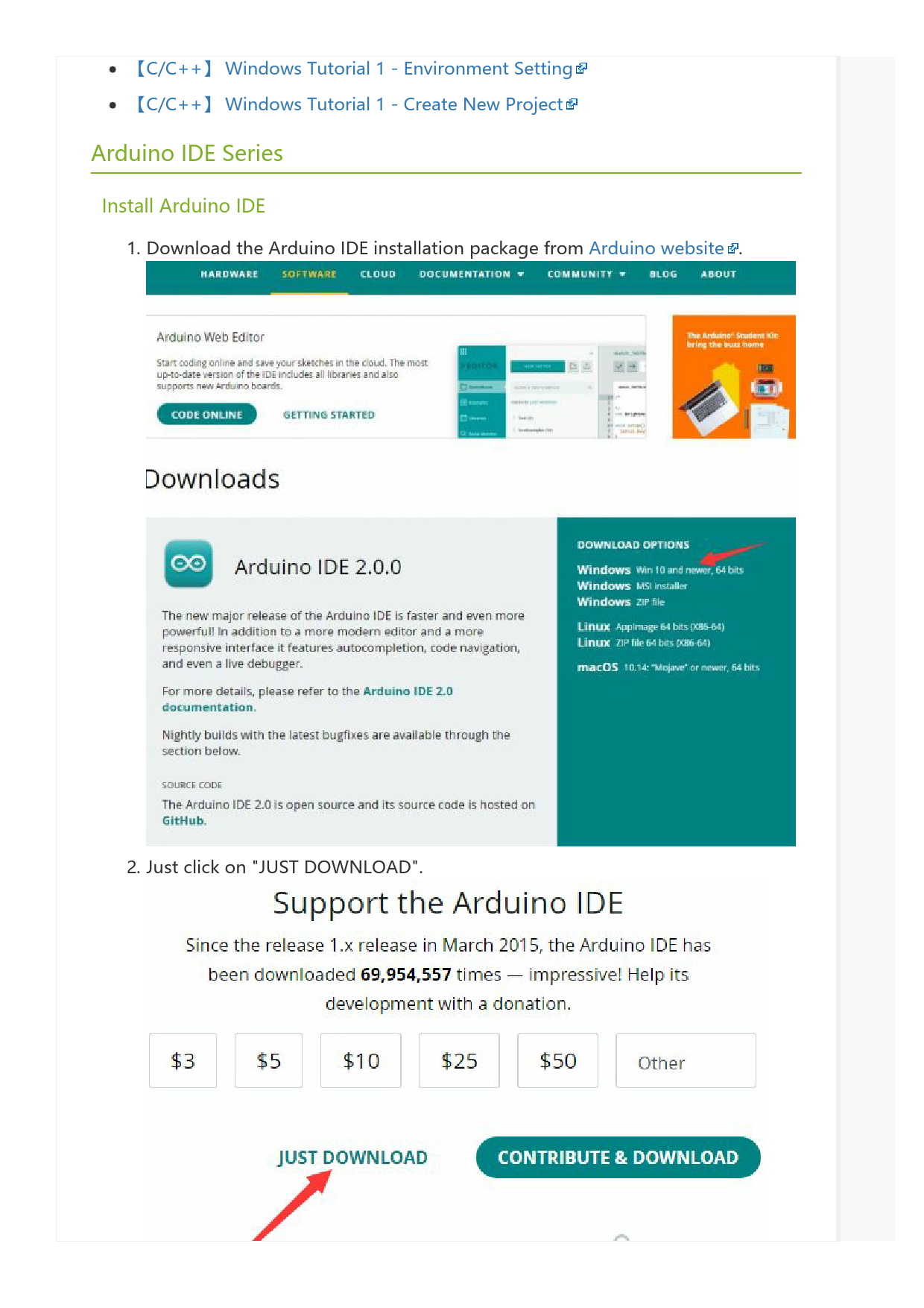 【C/C++】 Windows Tutorial 1 - Environment Setting 【C/C++】 Windows Tutorial 1 - Create New Project Arduino IDE Series Install Arduino IDE 1. Download the Arduino IDE installation package from Arduino website . 2. Just click on "JUST DOWNLOAD".