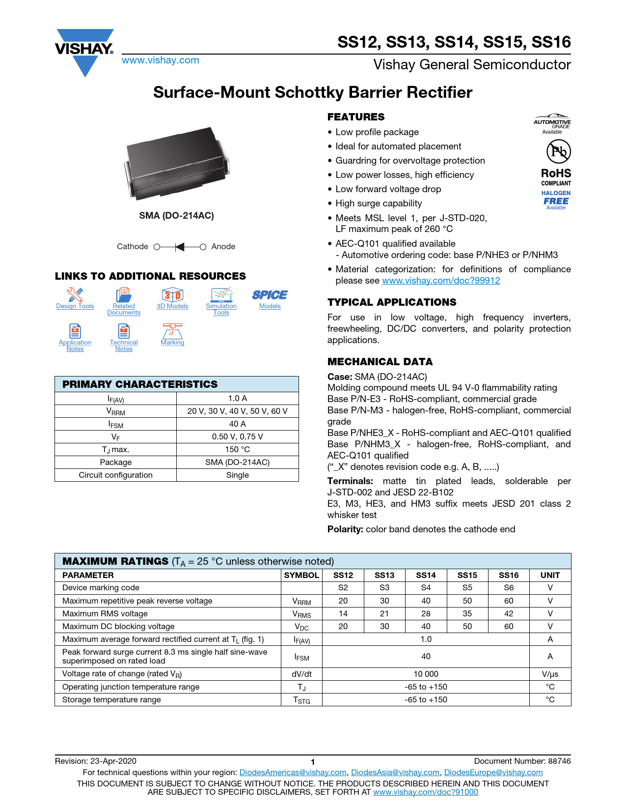 Datasheet SS12, SS13, SS14, SS15, SS16 (Vishay)