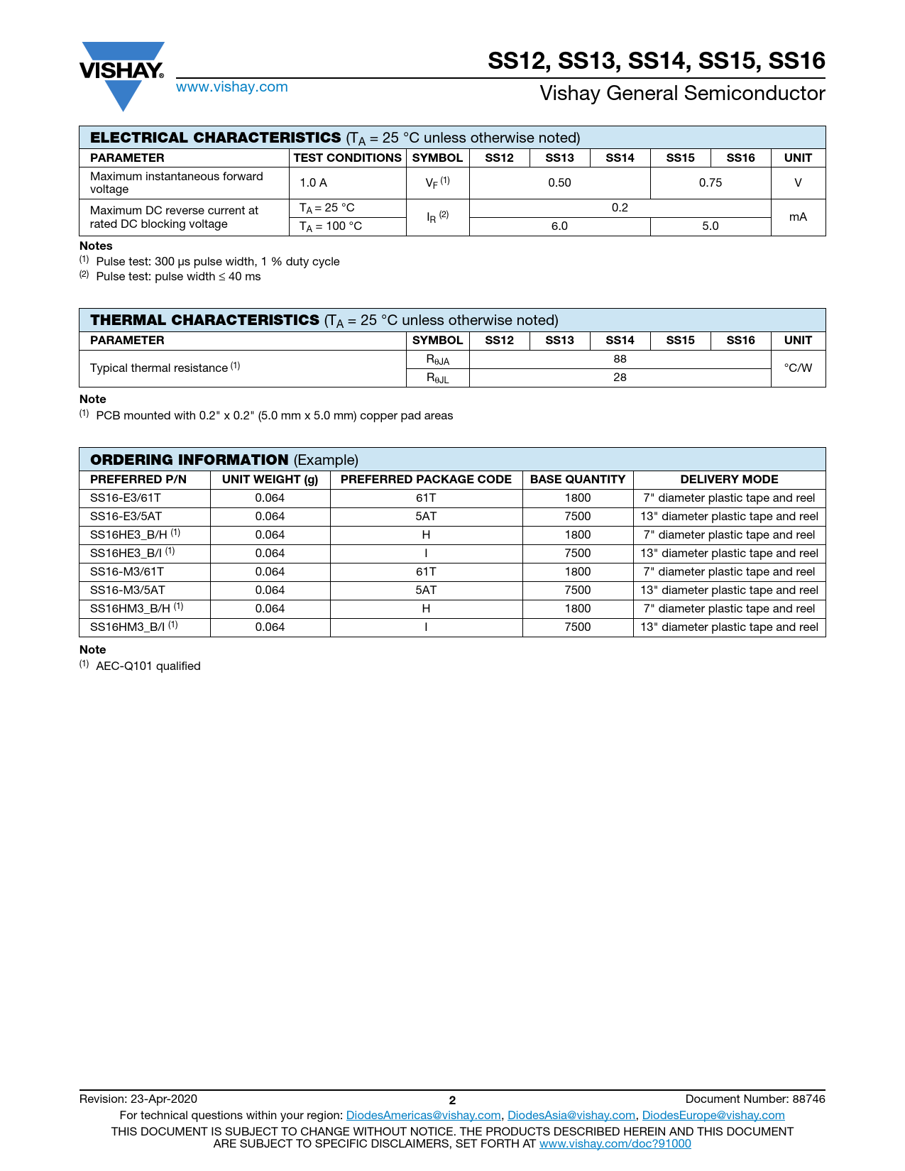 SS12, SS13, SS14, SS15, SS16 www.vishay.com Vishay General Semiconductor ELECTRICAL CHARACTERISTICS (TA = 25 °C unless otherwise noted) PARAMETERTEST CONDITIONS SYMBOLSS12SS13SS14SS15SS16UNIT Maximum instantaneous forward 1.0 A V (1) 0.50 0.75 V voltage F Maximum DC reverse current at TA = 25 °C 0.2 I mA rated DC blocking voltage R (2) TA = 100 °C 6.0 5.0 Notes (1) Pulse test: 300 μs pulse width, 1 % duty cycle (2) Pulse test: pulse width ≤ 40 ms THERMAL CHARACTERISTICS (TA = 25 °C unless otherwise noted) PARAMETERSYMBOLSS12SS13SS14SS15SS16UNIT RθJA 88 Typical thermal resistance (1) °C/W RθJL 28 Note (1) PCB mounted with 0.2" x 0.2" (5.0 mm x 5.0 mm) copper pad areas ORDERING INFORMATION (Example) PREFERRED P/NUNIT WEIGHT (g)PREFERRED PACKAGE CODEBASE QUANTITYDELIVERY MODE SS16-E3/61T 0.064 61T 1800 7" diameter plastic tape and reel SS16-E3/5AT 0.064 5AT 7500 13" diameter plastic tape and reel SS16HE3_B/H (1) 0.064 H 1800 7" diameter plastic tape and reel SS16HE3_B/I (1) 0.064 I 7500 13" diameter plastic tape and reel SS16-M3/61T 0.064 61T 1800 7" diameter plastic tape and reel SS16-M3/5AT 0.064 5AT 7500 13" diameter plastic tape and reel SS16HM3_B/H (1) 0.064 H 1800 7" diameter plastic tape and reel SS16HM3_B/I (1) 0.064 I 7500 13" diameter plastic tape and reel Note (1) AEC-Q101 qualified Revision: 23-Apr-2020 2 Document Number: 88746 For technical questions within your region: DiodesAmericas@vishay.com, DiodesAsia@vishay.com, DiodesEurope@vishay.com THIS DOCUMENT IS SUBJECT TO CHANGE WITHOUT NOTICE. THE PRODUCTS DESCRIBED HEREIN AND THIS DOCUMENT ARE SUBJECT TO SPECIFIC DISCLAIMERS, SET FORTH AT www.vishay.com/doc?91000