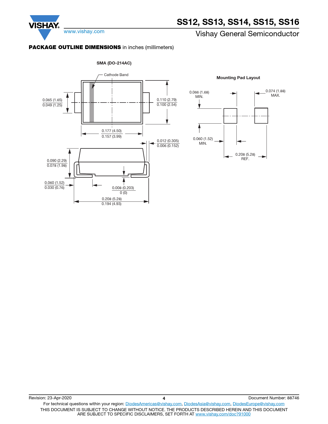SS12, SS13, SS14, SS15, SS16. PACKAGE OUTLINE DIMENSIONS. SMA (DO-214AC). Mounting Pad Layout