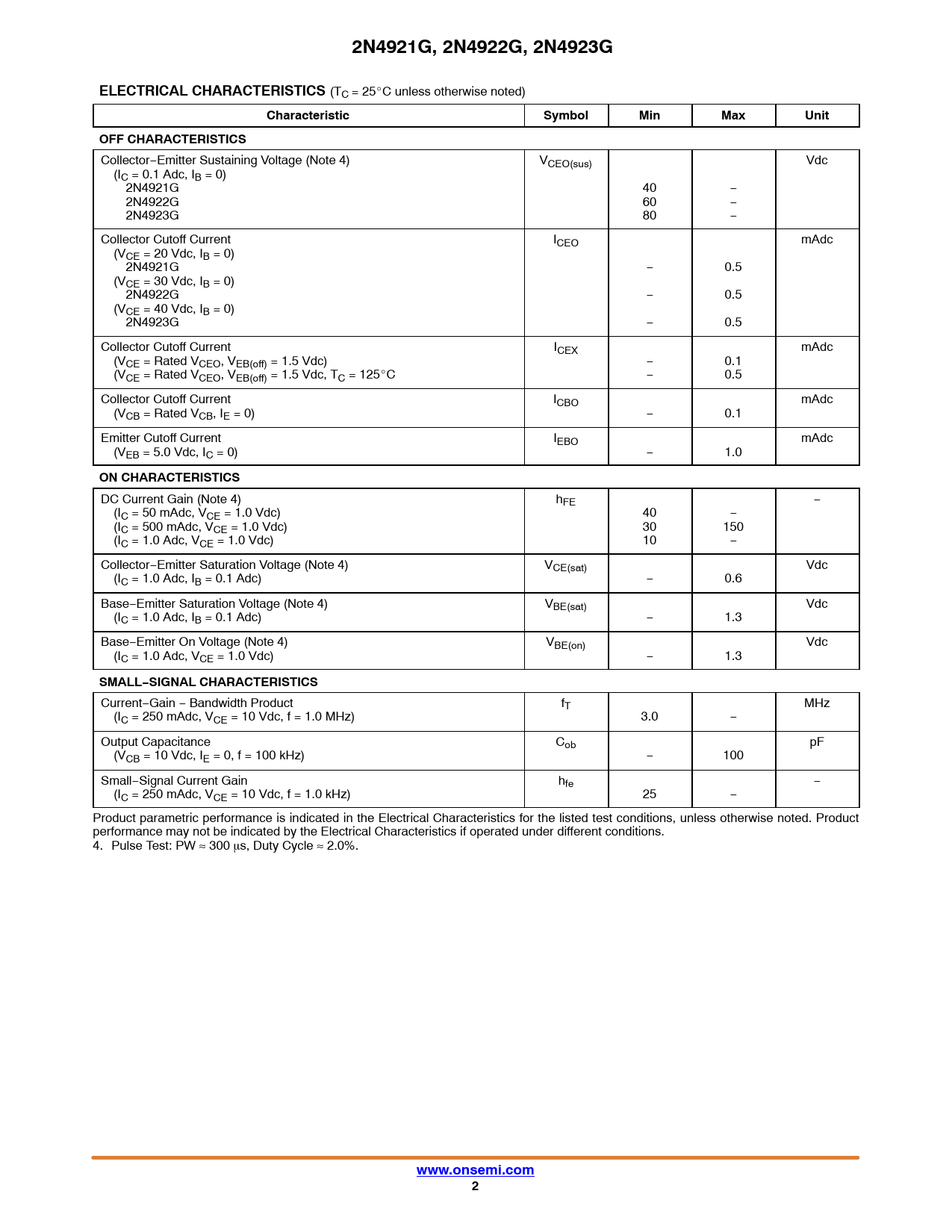 2N4921G, 2N4922G, 2N4923G. ELECTRICAL CHARACTERISTICS. Characteristic. Symbol. Min. Max. Unit. OFF CHARACTERISTICS. ON CHARACTERISTICS