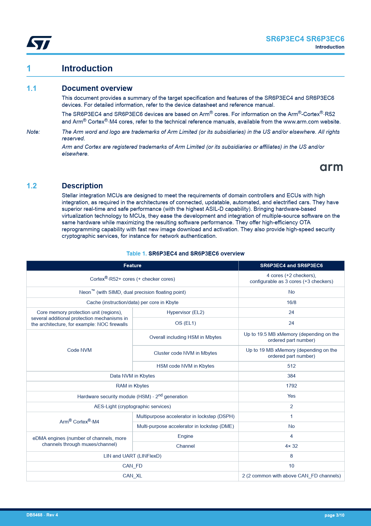 This document provides a summary of the target specification and features of the SR6P3EC4 and SR6P3EC6 devices. For detailed information, refer to the device datasheet and reference manual. The SR6P3EC4 and SR6P3EC6 devices are based on Arm® cores. For information on the Arm®-Cortex®‑R52 and Arm® Cortex®‑M4 cores, refer to the technical reference manuals, available from the www.arm.com website. Note: The Arm word and logo are trademarks of Arm Limited (or its subsidiaries) in the US and/or elsewhere. All rights reserved. Arm and Cortex are registered trademarks of Arm Limited (or its subsidiaries or affiliates) in the US and/or elsewhere.