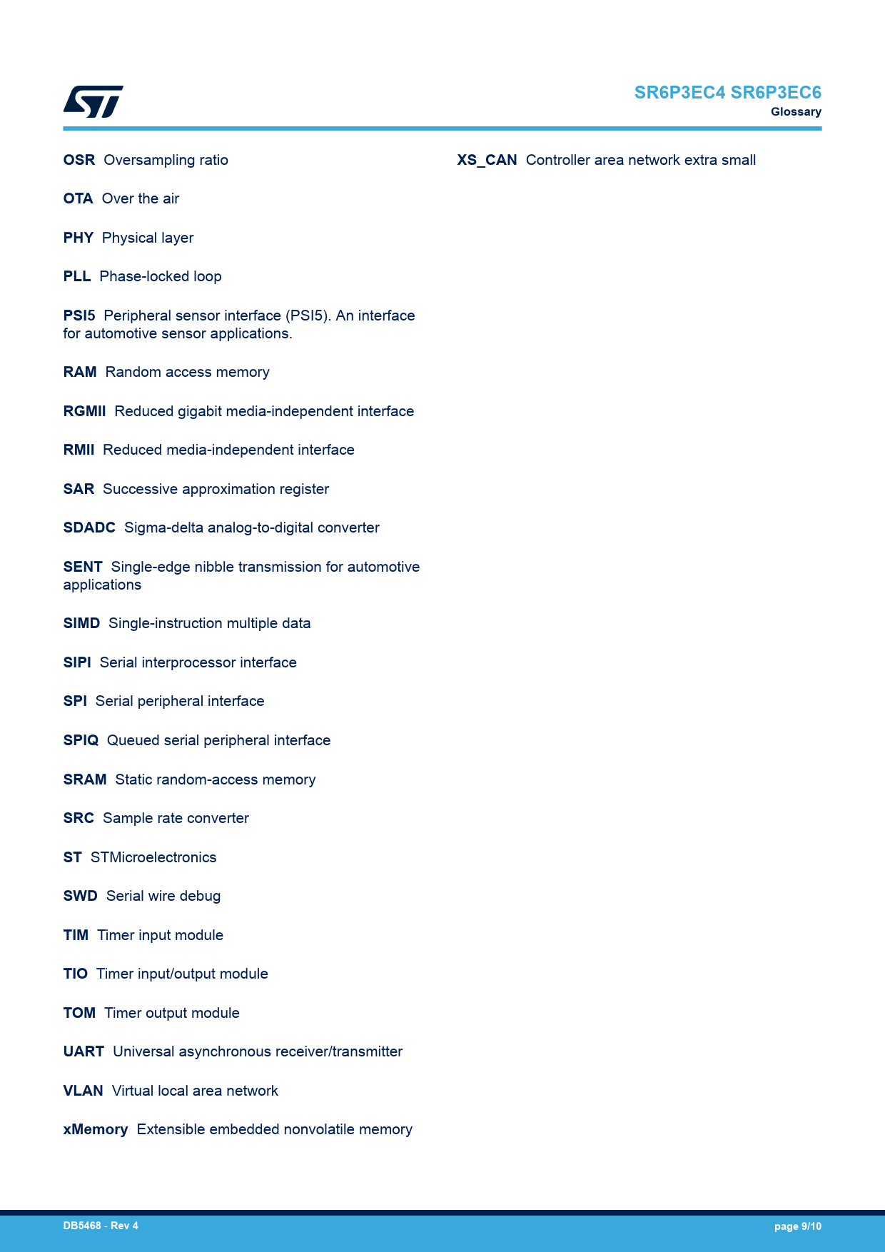 SR6P3EC4 SR6P3EC6GlossaryOSR Oversampling ratio XS_CAN Controller area network extra small OTA Over the air PHY Physical layer PLL Phase-locked loop PSI5 Peripheral sensor interface (PSI5). An interface for automotive sensor applications. RAM Random access memory RGMII Reduced gigabit media-independent interface RMII Reduced media-independent interface SAR Successive approximation register SDADC Sigma-delta analog-to-digital converter SENT Single-edge nibble transmission for automotive applications SIMD Single-instruction multiple data SIPI Serial interprocessor interface SPI Serial peripheral interface SPIQ Queued serial peripheral interface SRAM Static random-access memory SRC Sample rate converter ST STMicroelectronics SWD Serial wire debug TIM Timer input module TIO Timer input/output module TOM Timer output module UART Universal asynchronous receiver/transmitter VLAN Virtual local area network xMemory Extensible embedded nonvolatile memory DB5468 - Rev 4page 9/10 Document Outline SR6P3EC4 SR6P3EC6 Features 1 Introduction 1.1 Document overview 1.2 Description 1.3 Block diagram 2 Ordering information Revision history Glossary ADC AEC AES ASIL ATOM CAN CAN FD® CAN XL® CPU CRC DCF DMA DSP eDMA EMC EVITA FCCU FPBGA FPU GB GPIO GTM HSM I/O I2C IEC IEEE IPv4 IPv6 ISO JTAG KB LIN LVDS M_TTCAN MB MCAN MCS MCU MII NoC NPU NVM OA3p OS OSR OTA PHY PLL PSI5 RAM RGMII RMII SAR SDADC SENT SIMD SIPI SPI SPIQ SRAM SRC ST SWD TIM TIO TOM UART VLAN xMemory XS_CAN