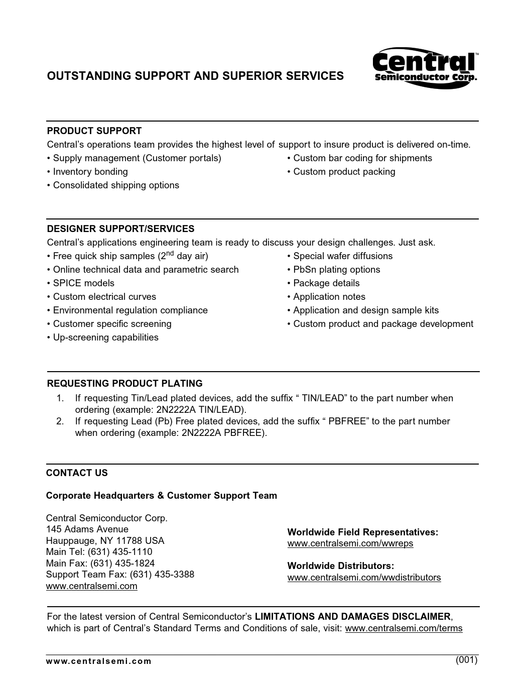 Central’s applications engineering team is ready to discuss your design challenges. Just ask. • Free quick ship samples (2nd day air) • Special wafer diffusions • Online technical data and parametric search • PbSn plating options • SPICE models • Package details • Custom electrical curves • Application notes • Environmental regulation compliance • Application and design sample kits • Customer specific screening • Custom product and package development • Up-screening capabilities
