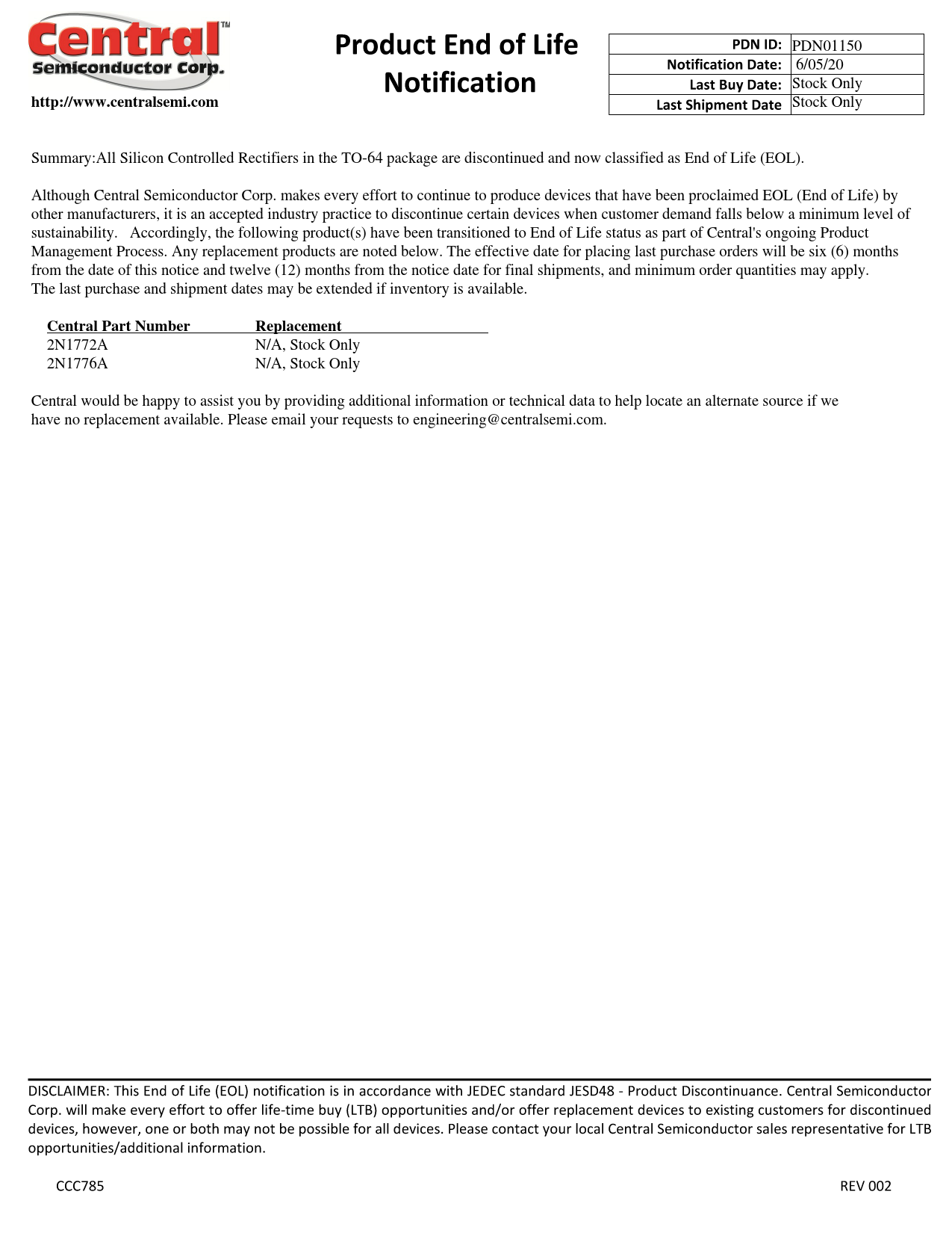 PDN01150 6/05/20 Stock Only http://www.centralsemi.com Stock Only Summary:All Silicon Controlled Rectifiers in the TO-64 package are discontinued and now classified as End of Life (EOL). Although Central Semiconductor Corp. makes every effort to continue to produce devices that have been proclaimed EOL (End of Life) by other manufacturers, it is an accepted industry practice to discontinue certain devices when customer demand falls below a minimum level of sustainability. Accordingly, the following product(s) have been transitioned to End of Life status as part of Central's ongoing Product Management Process. Any replacement products are noted below. The effective date for placing last purchase orders will be six (6) months from the date of this notice and twelve (12) months from the notice date for final shipments, and minimum order quantities may apply. The last purchase and shipment dates may be extended if inventory is available. Central Part NumberReplacement 2N1772A N/A, Stock Only 2N1776A N/A, Stock Only Central would be happy to assist you by providing additional information or technical data to help locate an alternate source if we have no replacement available. Please email your requests to engineering@centralsemi.com.