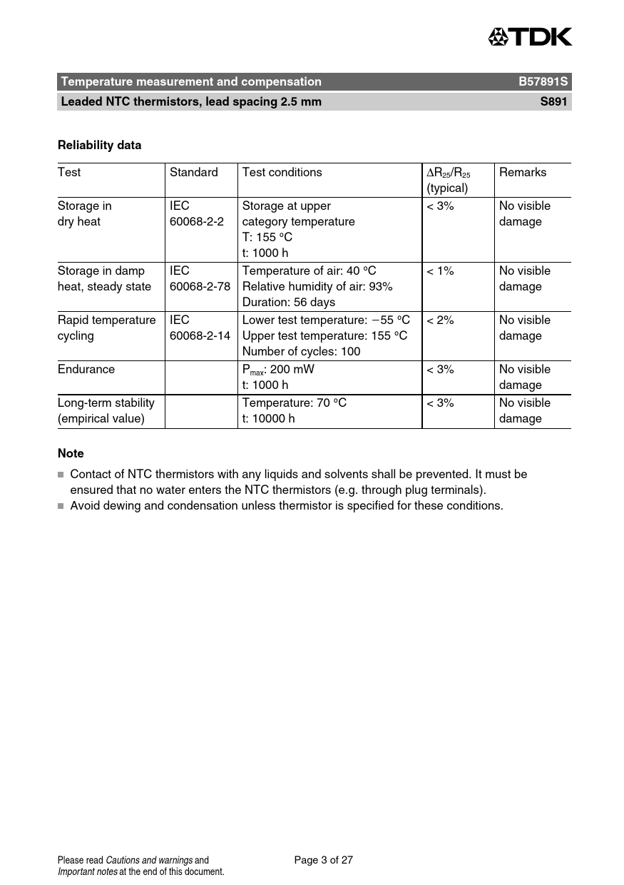 Temperature measurement and compensation. B57891S. Leaded NTC thermistors, lead spacing 2.5 mm. S891. Reliability data. Note