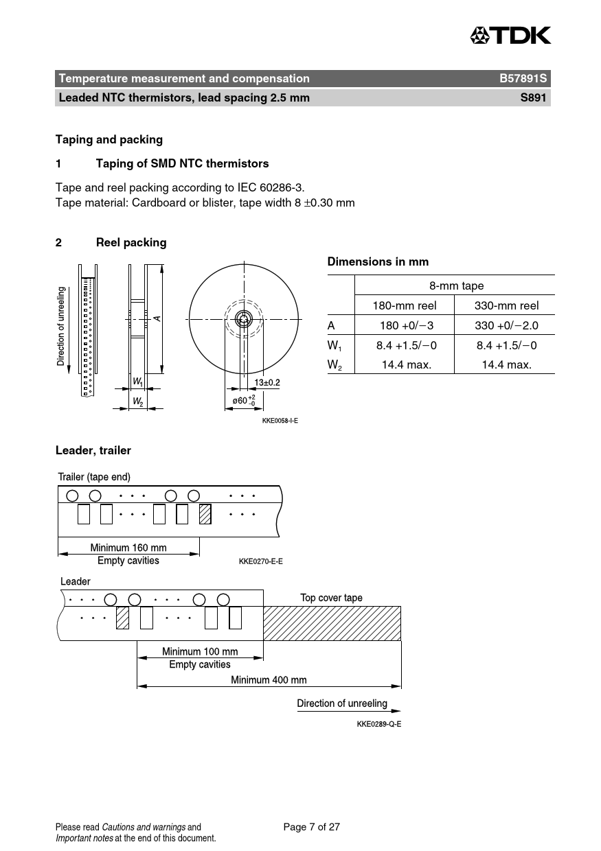 Temperature measurement and compensationB57891SLeaded NTC thermistors, lead spacing 2.5 mmS891Taping and packing1Taping of SMD NTC thermistors Tape and reel packing according to IEC 60286-3. Tape material: Cardboard or blister, tape width 8 ±0.30 mm 2Reel packingDimensions in mm 8-mm tape 180-mm reel 330-mm reel A 180 +0/3 330 +0/2.0 W1 8.4 +1.5/0 8.4 +1.5/0 W2 14.4 max. 14.4 max. Leader, trailer Please read Cautions and warnings and Page 7 of 27 Important notes at the end of this document. Document Outline Cover
