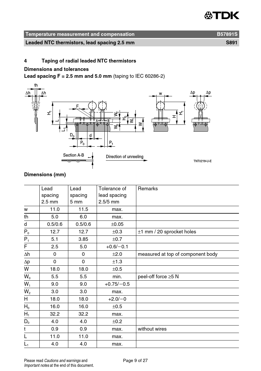 Temperature measurement and compensation B57891S Leaded NTC thermistors, lead spacing 2.5 mm S891 4 Taping of radial leaded NTC thermistors Dimensions and tolerances Lead spacing F = 2.5 mm and 5.0 mm