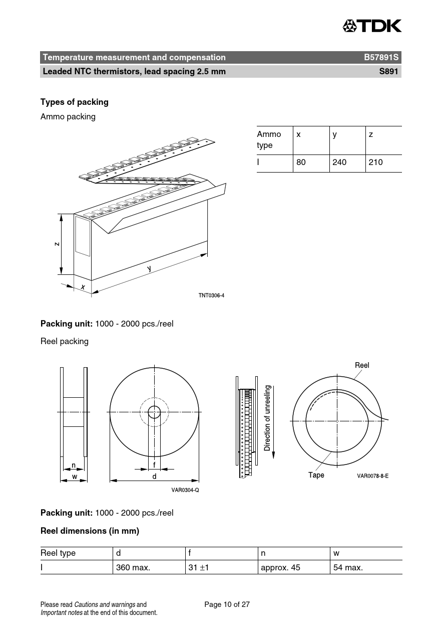 Temperature measurement and compensation. B57891S. Leaded NTC thermistors, lead spacing 2.5 mm. S891. Types of packing