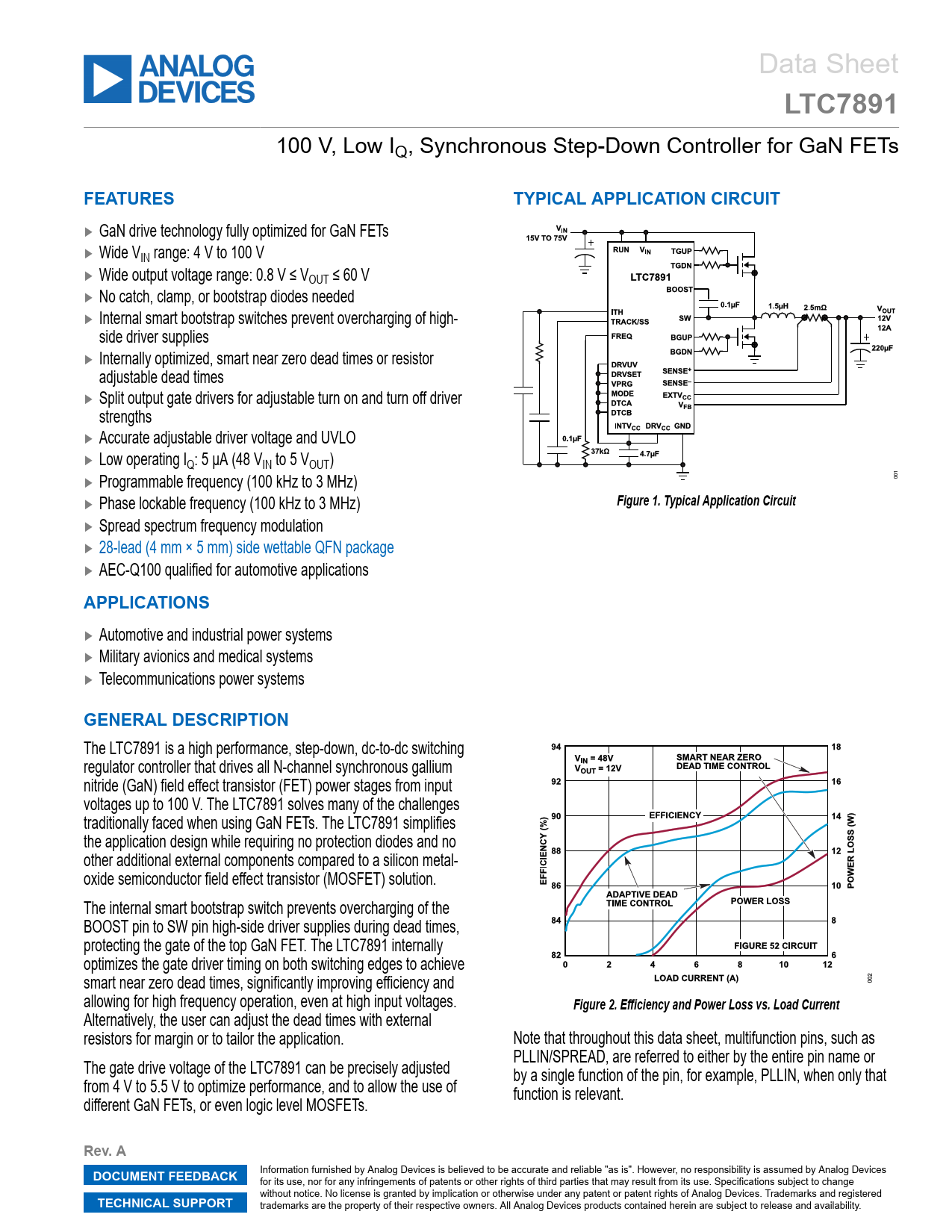 The LTC7891 is a high performance, step-down, dc-to-dc switching regulator controller that drives all N-channel synchronous gallium nitride (GaN) field effect transistor (FET) power stages from input voltages up to 100 V. The LTC7891 solves many of the challenges traditionally faced when using GaN FETs. The LTC7891 simplifies the application design while requiring no protection diodes and no other additional external components compared to a silicon metal- oxide semiconductor field effect transistor (MOSFET) solution. The internal smart bootstrap switch prevents overcharging of the BOOST pin to SW pin high-side driver supplies during dead times, protecting the gate of the top GaN FET. The LTC7891 internally optimizes the gate driver timing on both switching edges to achieve smart near zero dead times, significantly improving efficiency and allowing for high frequency operation, even at high input voltages.