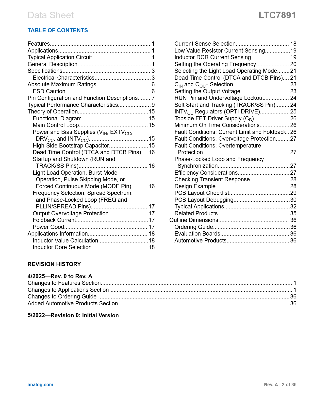 Pages / Page36 / 2 — LTC7891. TABLE OF CONTENTS. REVISION HISTORY. 4/2025—Rev. 0 to Rev. A. …