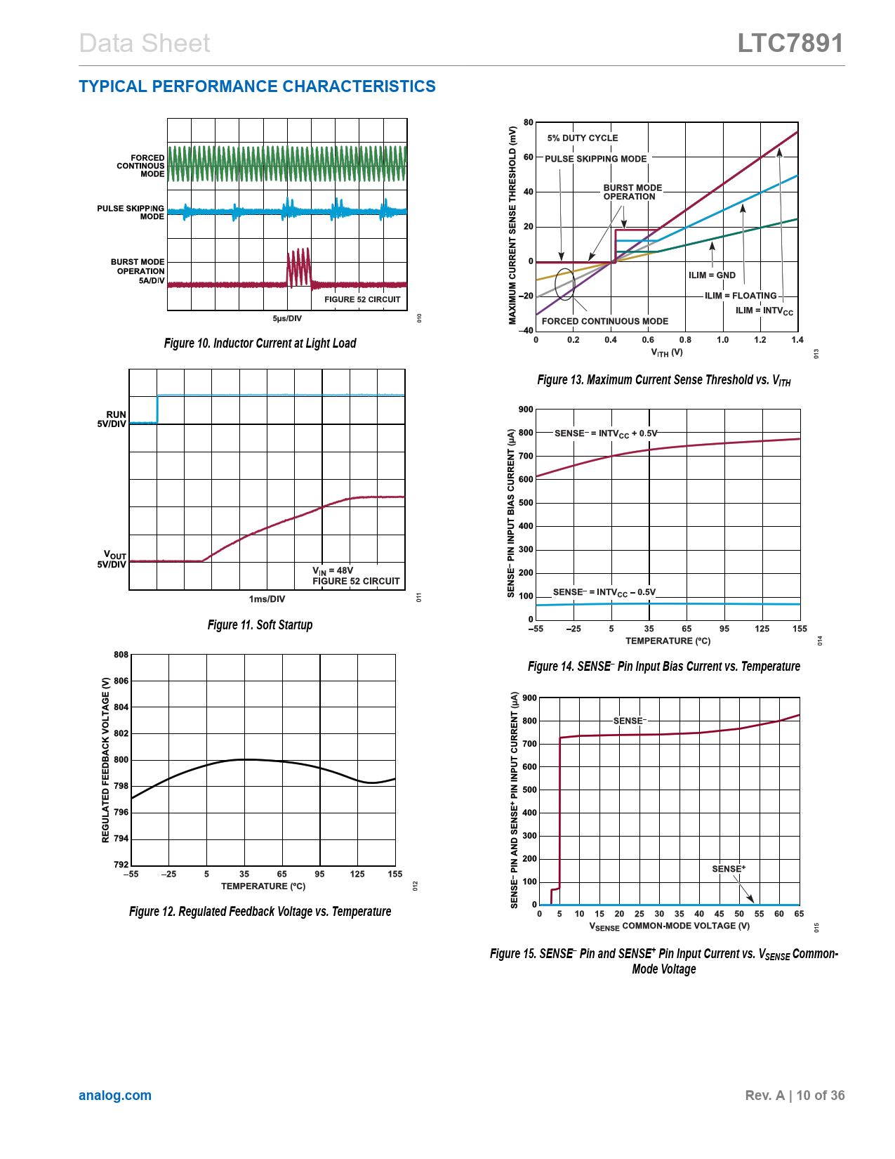 LTC7891 TYPICAL PERFORMANCE CHARACTERISTICS Figure 10. Inductor Current at Light Load Figure 13. Maximum Current Sense Threshold vs. VITH Figure 11. Soft Startup Figure 14. SENSE– Pin Input Bias Current vs. Temperature Figure 12. Regulated Feedback Voltage vs. Temperature Figure 15. SENSE– Pin and SENSE+ Pin Input Current vs. VSENSE Common- Mode Voltage analog.com Rev. A | 10 of 36