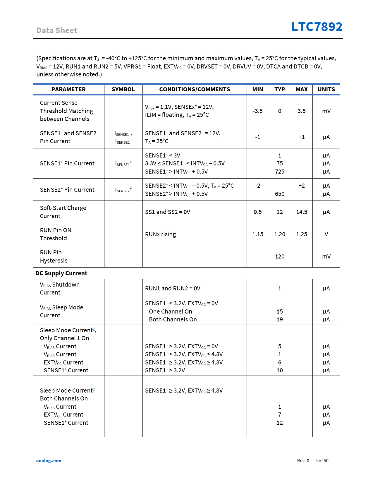 Pages / Page50 / 5 — Data Sheet. LTC7892. PARAMETER. SYMBOL. CONDITIONS/COMMENTS. MIN. TYP. …