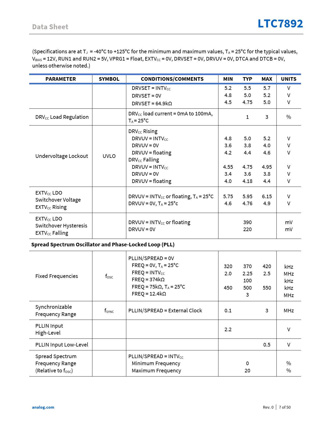 Pages / Page50 / 7 — Data Sheet. LTC7892. PARAMETER. SYMBOL. CONDITIONS/COMMENTS. MIN. TYP. …