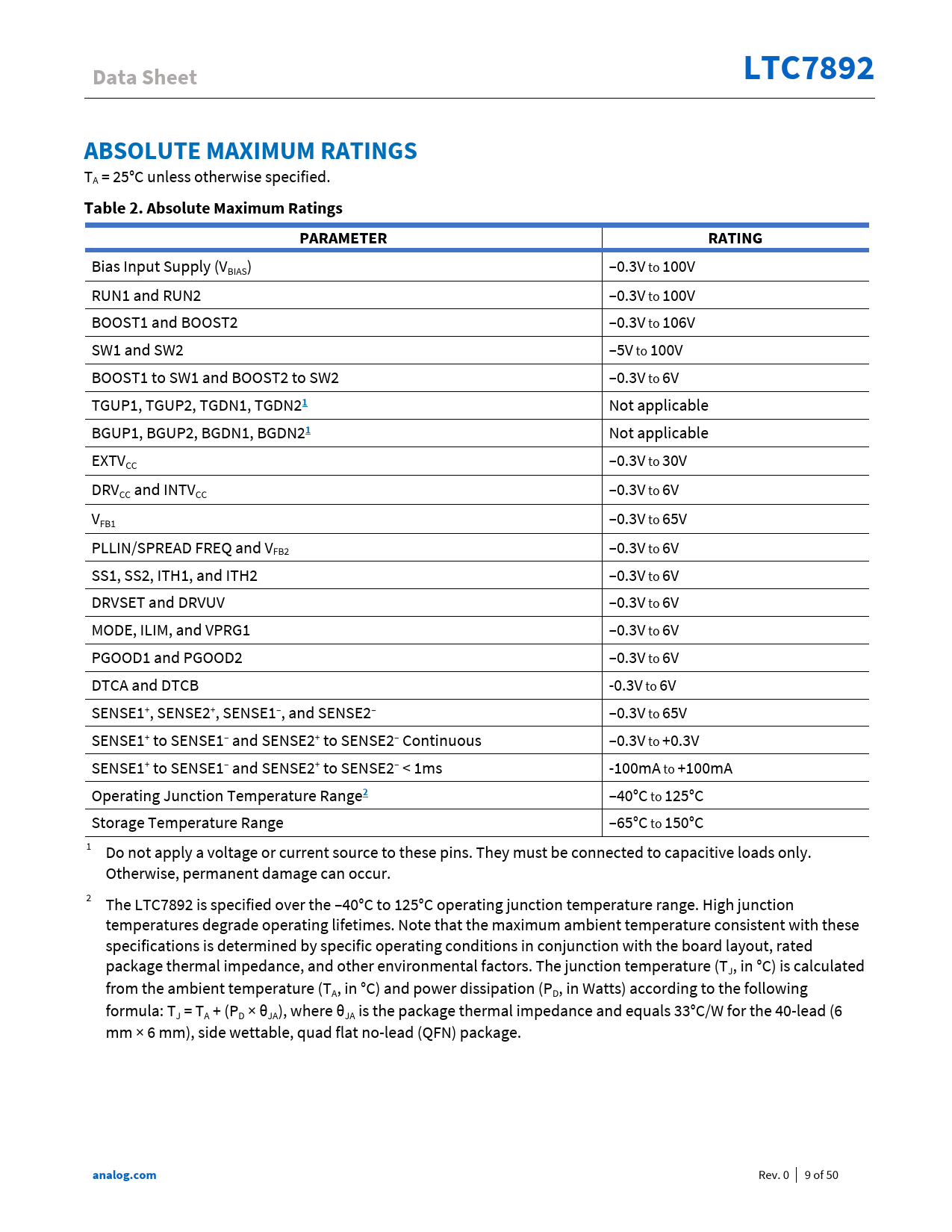 Pages / Page50 / 9 — Data Sheet. LTC7892. ABSOLUTE MAXIMUM RATINGS. Table 2. Absolute Maximum …