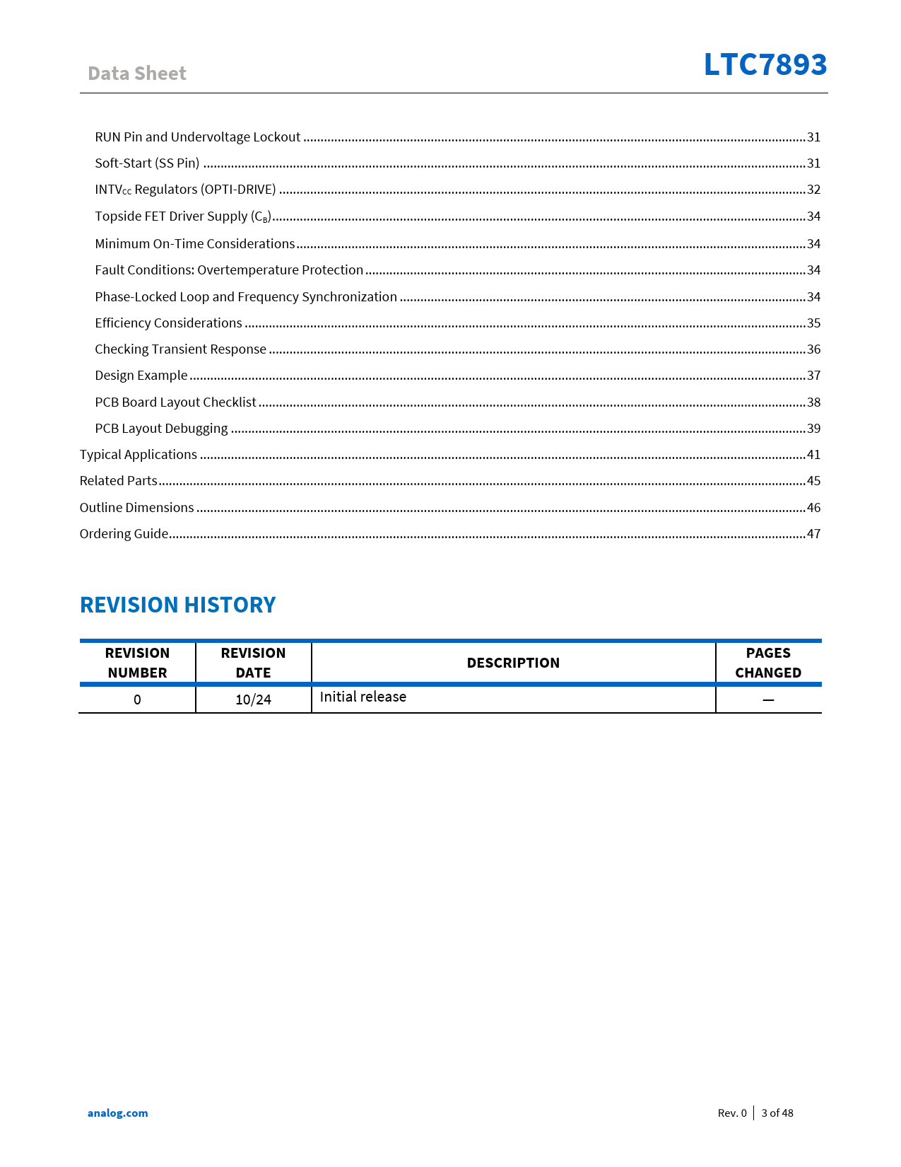 link to page 31 link to page 31 link to page 32 link to page 34 link to page 34 link to page 34 link to page 34 link to page 35 link to page 36 link to page 37 link to page 38 link to page 39 link to page 41 link to page 45 link to page 46 link to page 47 Data SheetLTC7893 RUN Pin and Undervoltage Lockout .. 31 Soft-Start (SS Pin) ... 31 INTVCC Regulators (OPTI-DRIVE) ... 32 Topside FET Driver Supply (CB) ... 34 Minimum On-Time Considerations .. 34 Fault Conditions: Overtemperature Protection .. 34 Phase-Locked Loop and Frequency Synchronization .. 34 Efficiency Considerations ... 35 Checking Transient Response .. 36 Design Example ... 37 PCB Board Layout Checklist ... 38 PCB Layout Debugging ... 39 Typical Applications .. 41 Related Parts .. 45 Outline Dimensions ... 46 Ordering Guide ... 47 REVISION HISTORYREVISIONREVISIONPAGESDESCRIPTIONNUMBERDATECHANGED 0 10/24 Initial release — analog.com Rev. 0 3 of 48 Document Outline Features Applications General Description Typical Application TABLE OF CONTENTS Revision History Specifications Absolute Maximum Ratings Pin Configurations and Function Descriptions Typical Performance Characteristics Functional diagram Theory of Operation Main Control Loop Power and Bias Supplies (VBIAS, EXTVCC, DRVCC, and INTVCC) High-Side Bootstrap Capacitor Dead Time Control (DTCA and DTCB Pins) Startup and Shutdown (RUN and SS Pins) Light Load Operation: Burst Mode Operation, Pulse-Skipping, or Forced Continuous Mode (MODE Pin) Frequency Selection, Spread Spectrum, and Phase-Locked Loop (FREQ and PLLIN/SPREAD Pins) Output Overvoltage Protection Power Good Applications Information Inductor Value Calculation Inductor Core Selection Current Sense Selection Low Value Resistor Current Sensing Inductor DCR Current Sensing Setting the Operating Frequency Selecting the Light-Load Operating Mode Dead Time Control (DTCA and DTCB Pins) DTCx Pin Tied to Ground (Adaptive Dead Time Control) DTCx Pin connected with a resistor to GND Power FET Selection CIN and COUT Selection Setting the Output Voltage RUN Pin and Undervoltage Lockout Soft-Start (SS Pin) INTVCC Regulators (OPTI-DRIVE) Topside FET Driver Supply (CB) Minimum On-Time Considerations Fault Conditions: Overtemperature Protection Phase-Locked Loop and Frequency Synchronization Efficiency Considerations Checking Transient Response Design Example PCB Board Layout Checklist PCB Layout Debugging Typical Applications Related Parts Outline Dimensions Ordering Guide